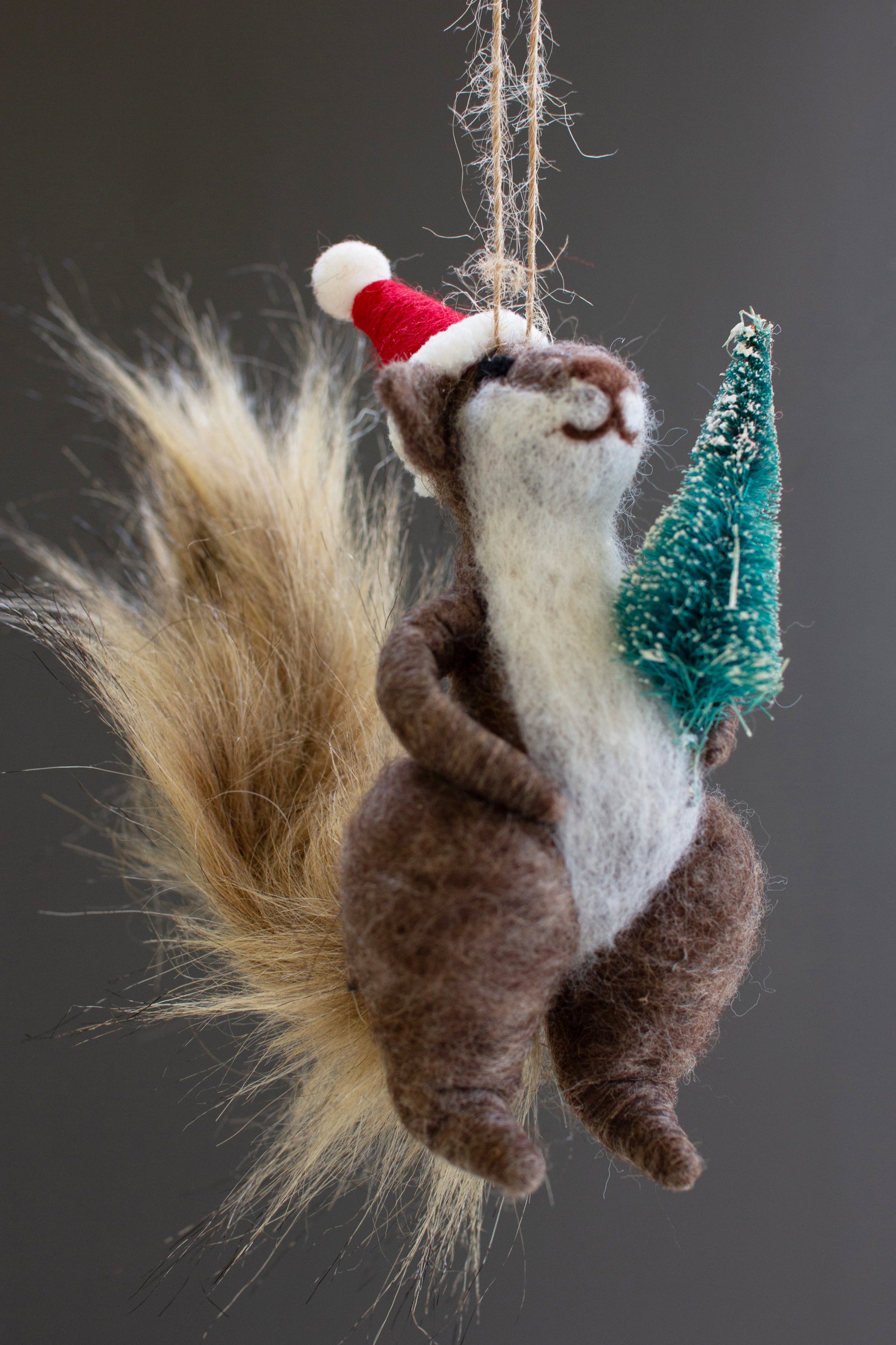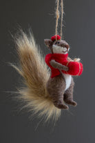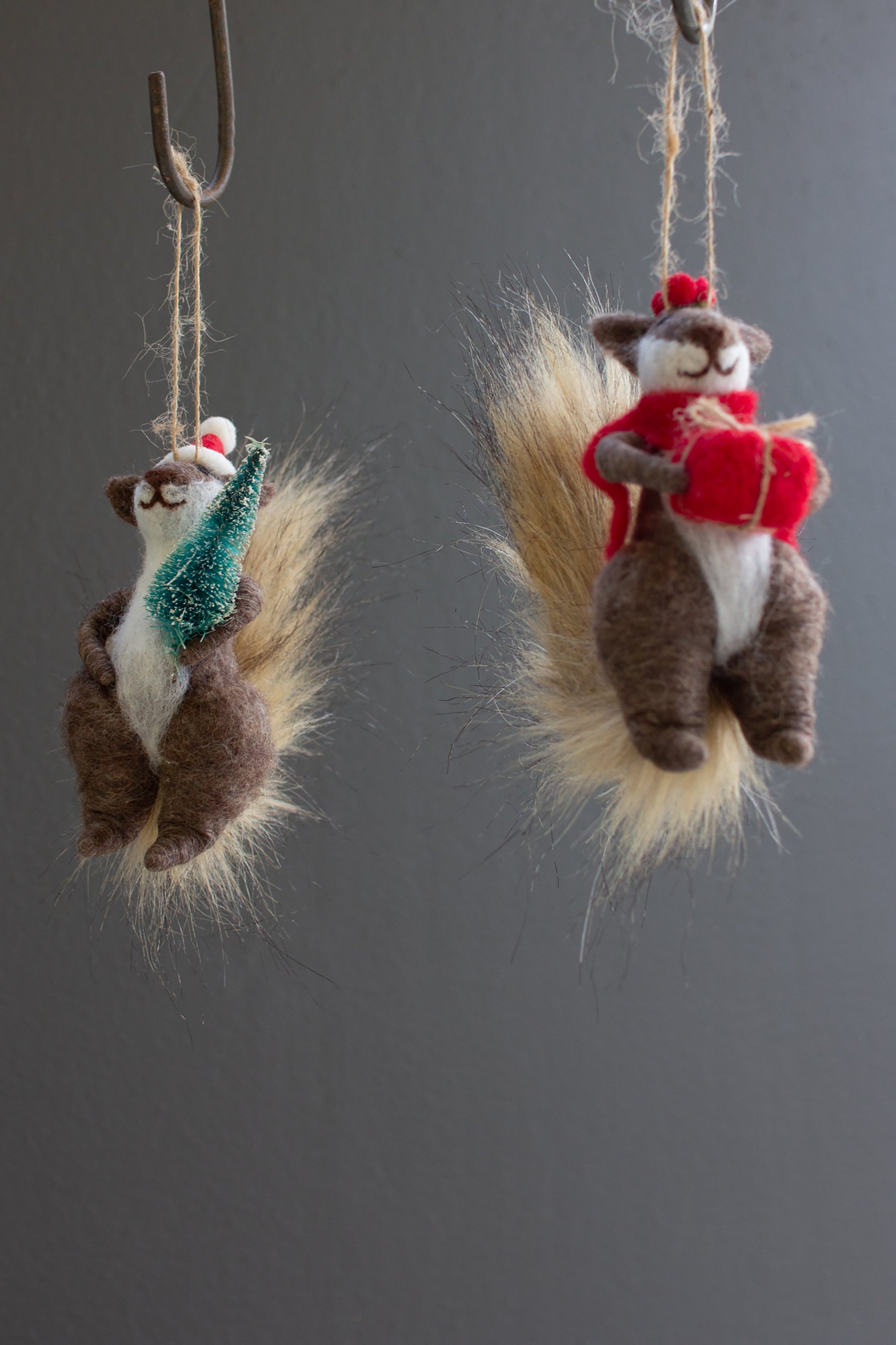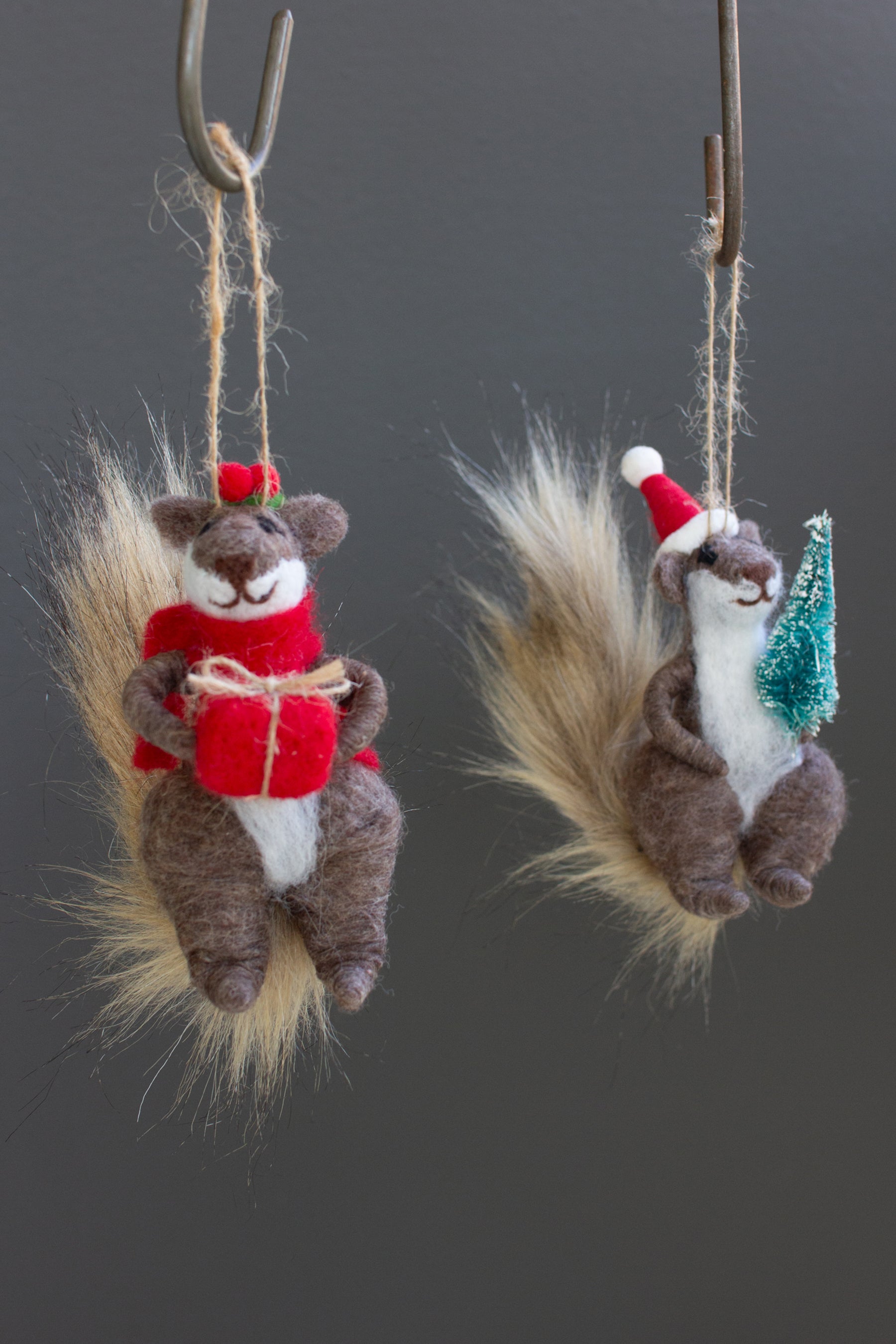 This set of two Christmas squirrels in hats will have your loved ones laughing. One squirrel holds a gift and the other a small Christmas tree. Gift one or a set to your nuttiest friend or keep this set for your tree. Tail is bendable.