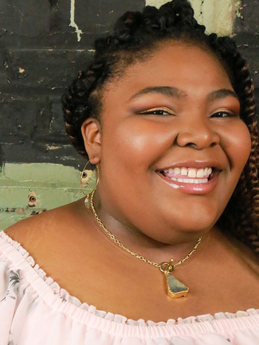 Labradorite with a raw cut makes up this gorgeous triangle necklace. On a short brass chain, this necklace is perfect for when you want to dress up your everyday Zoom look.