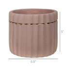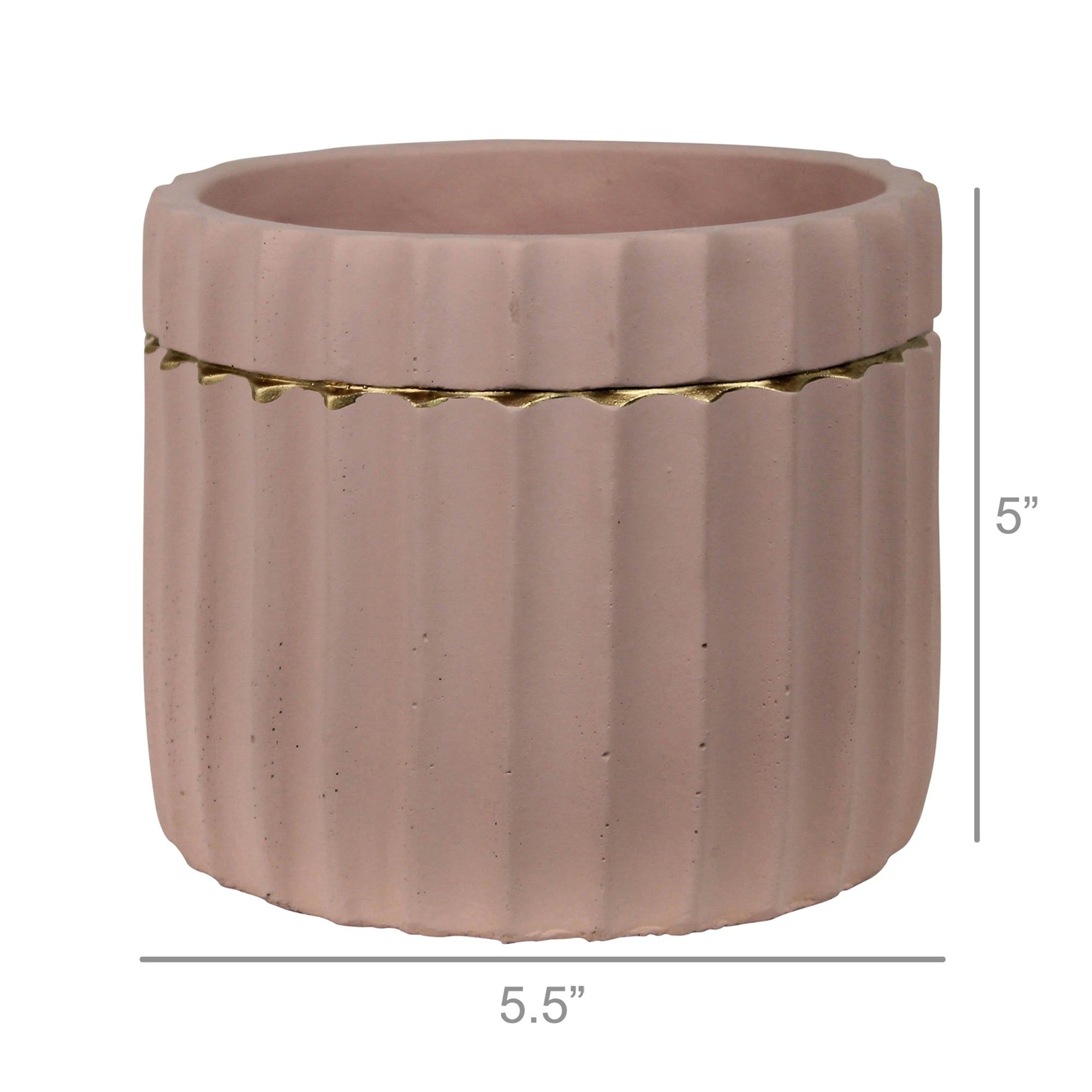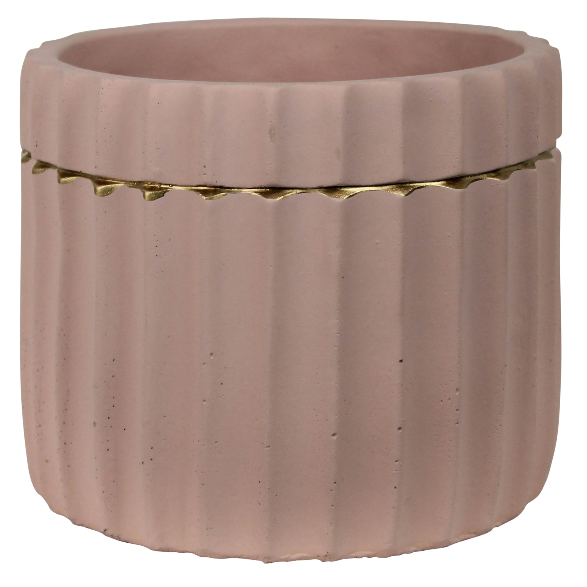 Constructed from sturdy cast cement this scalloped vessel features an embossed gold band, certain to dress up floral or garden decor. Watertight.