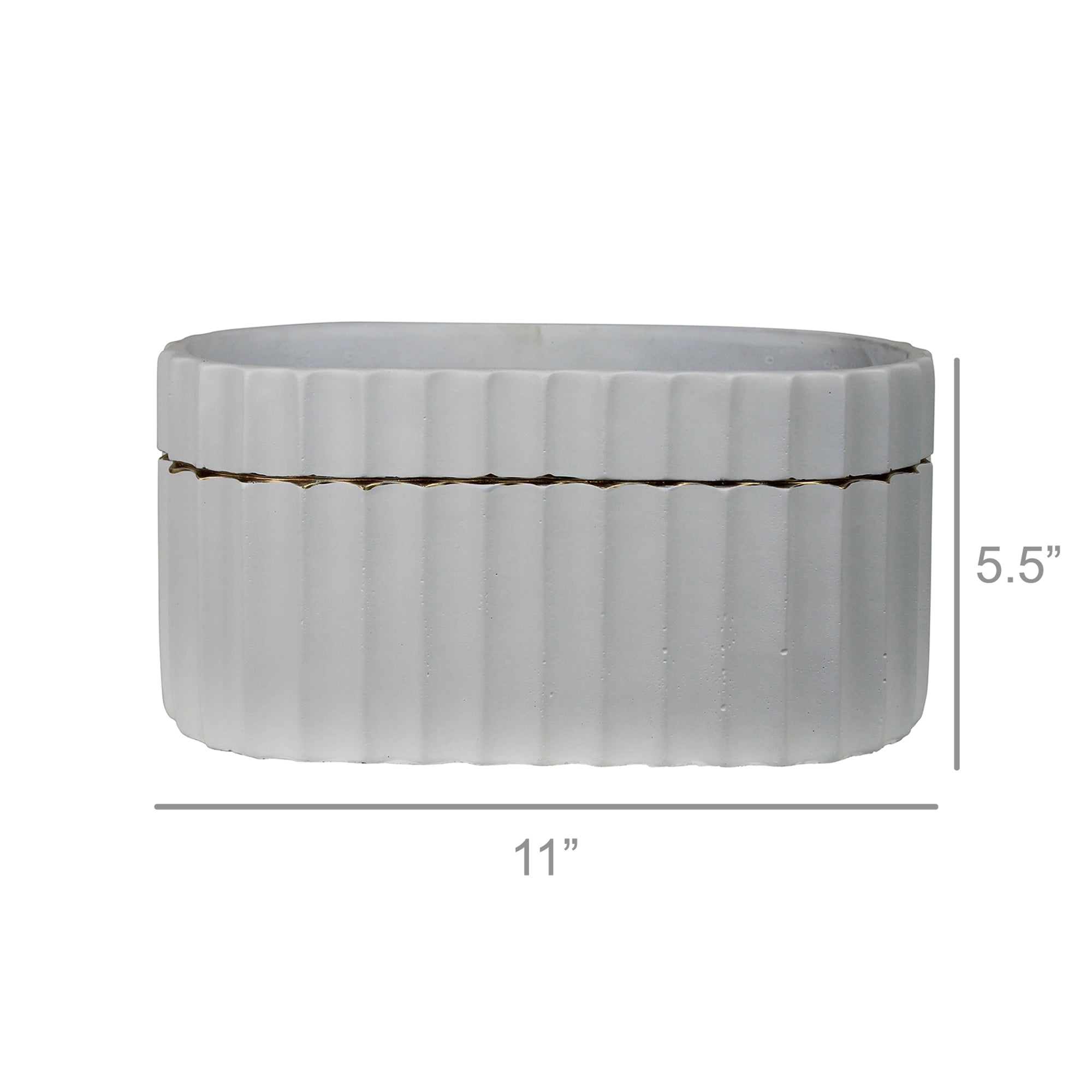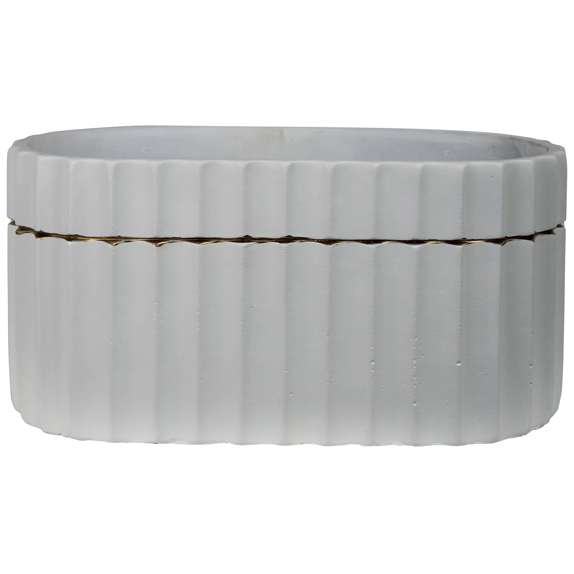 Constructed from sturdy cast cement this scalloped vessel features an embossed gold band, certain to dress up floral or garden decor. Watertight.