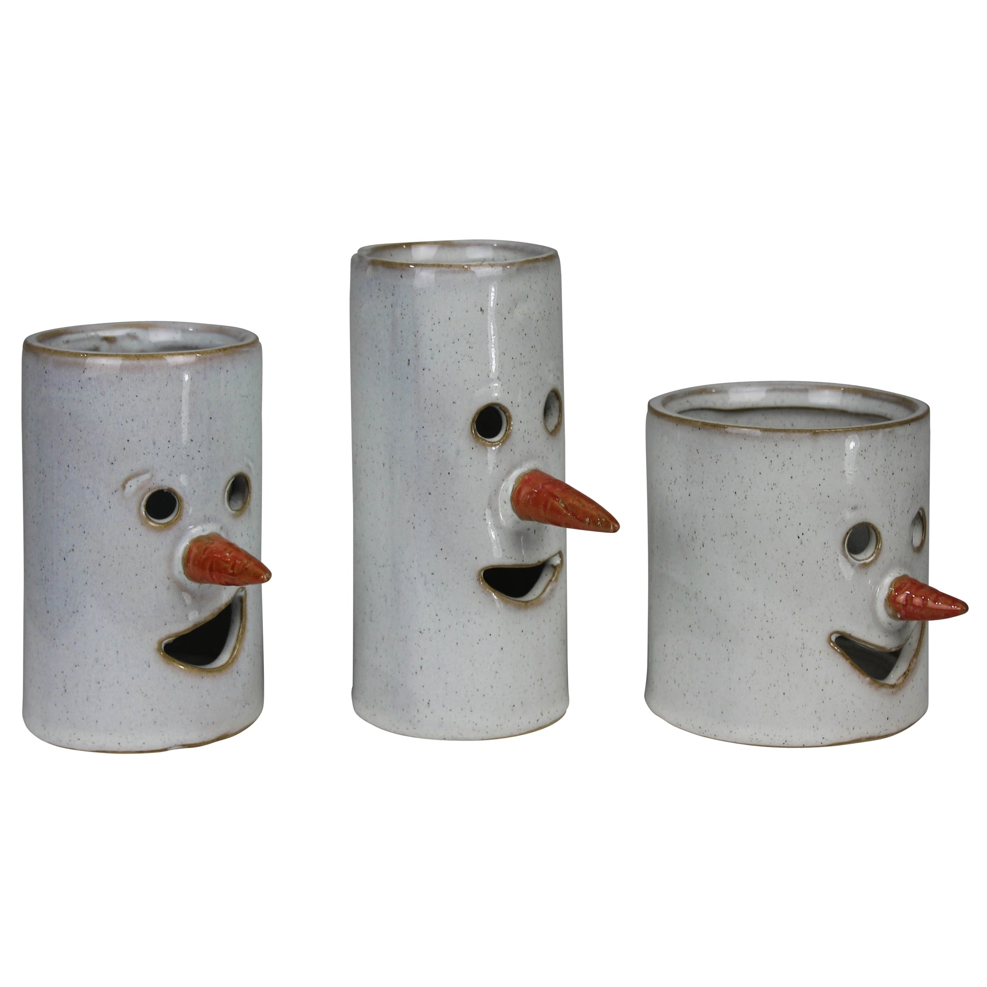 Set of 3 ceramic tealight holders featuring charming snowman faces. Perfect for adding a whimsical, festive touch to your holiday décor, these playful fellows gently illuminate any room, creating a warm and cozy winter atmosphere. 3x4x5, 3.5x4.5x4, 3x4x6,