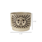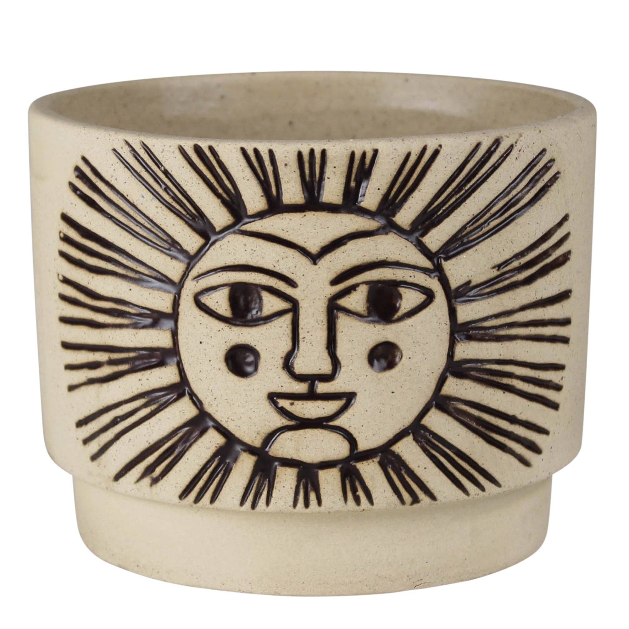 Plants need sun. The natural bisque clay glints of bronze radiating from the carved sun makes the sun shine year round. Sized for a 4” drop in pot.