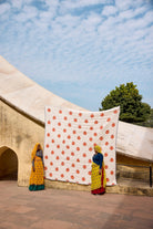 The design is hand-pressed onto each quilt using hand-carved wooden blocks dipped in dyes. The printed cotton shells are brought to the homes of quiltmakers, who stuff and stitch the quilts by hand, creating the final product.