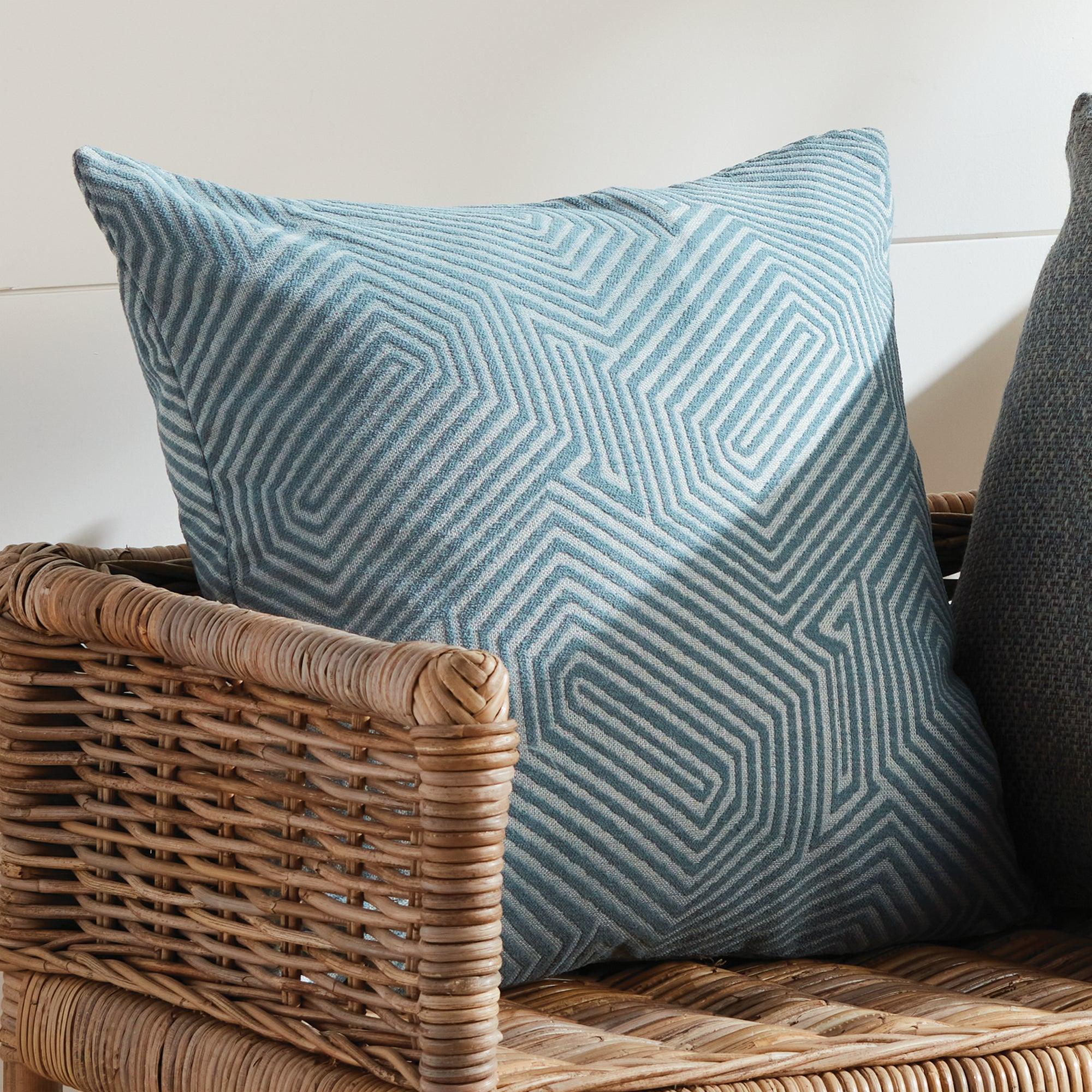 The indoor pillow that lives beautifully outdoors. Enjoy the upscale luxury and durability of Jacquard. With a modern french blue geometric pattern, it adds a pop of rich color to any palette. This pillow is weather resistant and responsibly made. Filled with 100% recycled fibers.