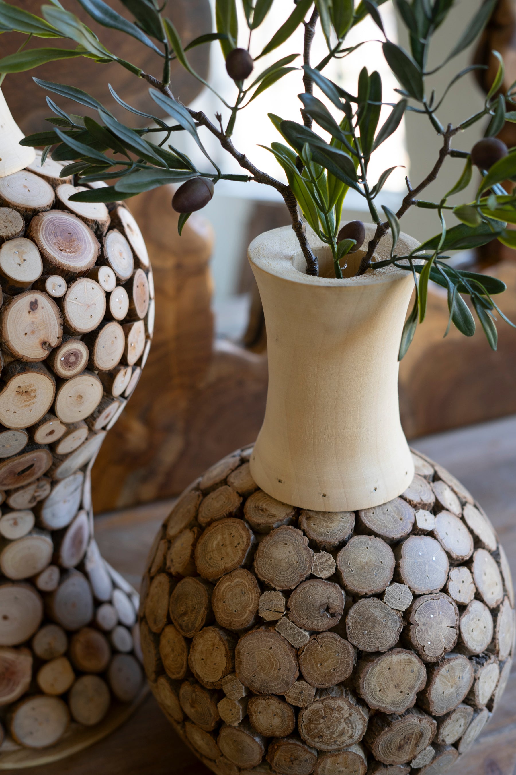 Add a natural touch to any area with this spliced wood bulb vase. Display fronds in this neutral 14" vase or let it speak for itself. It also makes a great gift paired with its 2 " partner. Exposed nail heads are part of the design and construction.