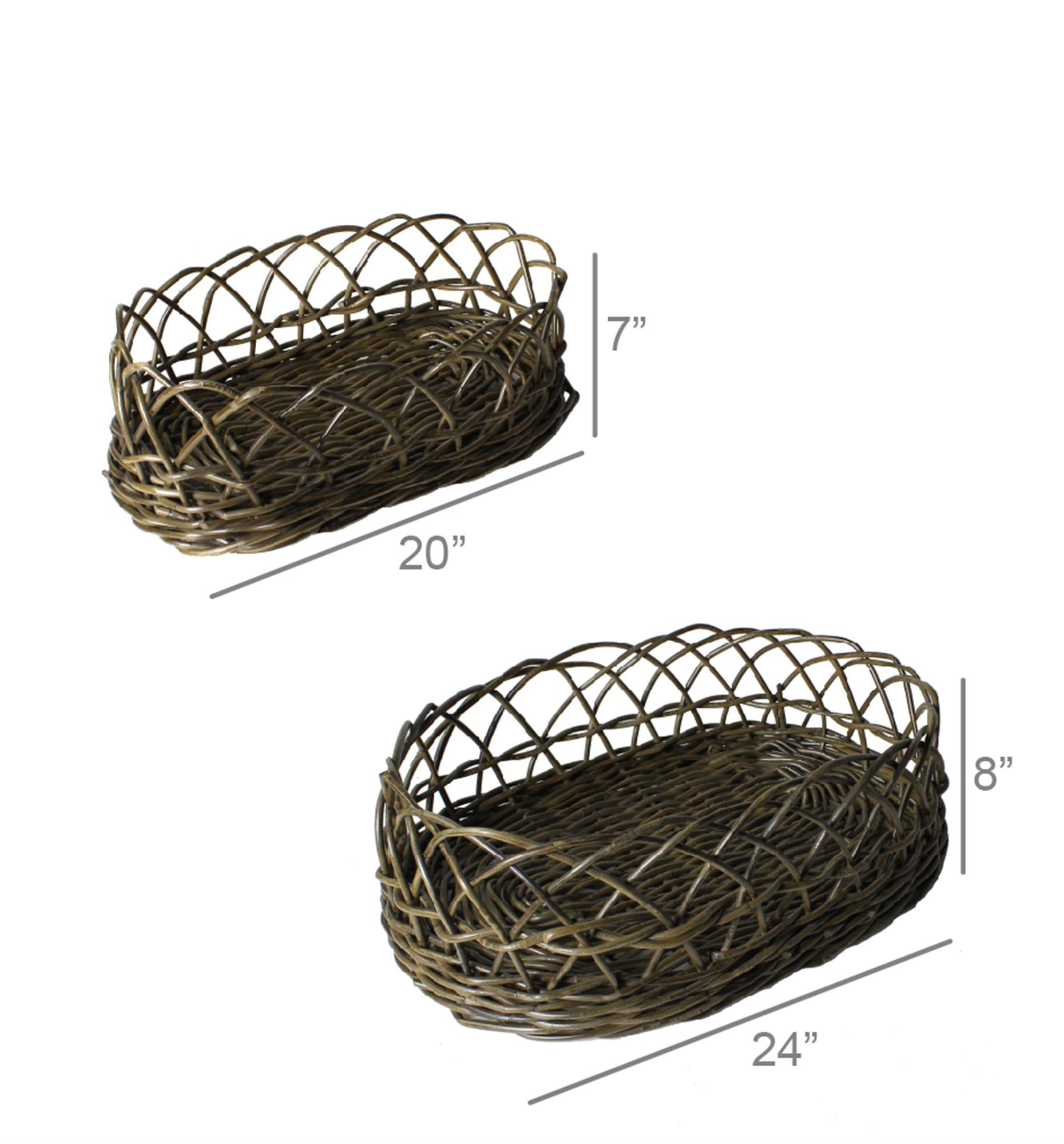 Woven rattan gives the Stamford Baskets a breezy elegance; the oval shape keeps things fun. The low and long proportions lend them to be filled with anything from fruit and flowers to towels and toys.