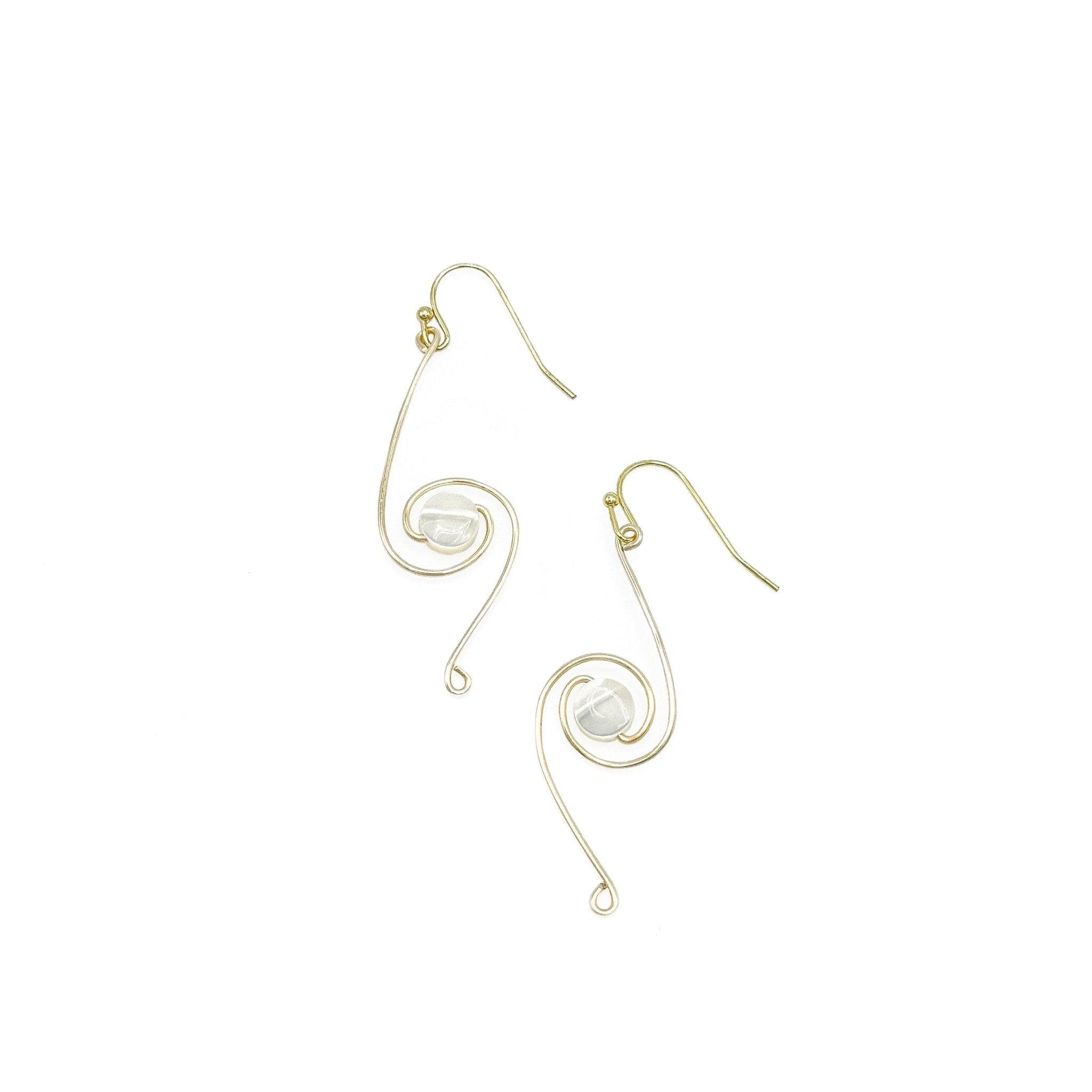 White moonstone flat round beads are suspended in the middle of a swirl of gold plated wire to form this celestial statement, but lightweight earring. The gold plated fishhooks are easy to put on and hypoallergenic.2 1/4 inch total length.