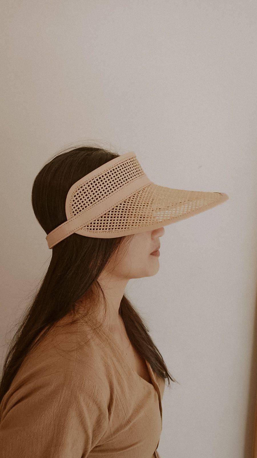 Keep it fun and sophisticated all while keeping the sun off your face with our rattan cane and leather visor. A vintage inspired piece with a modern and playful twist. Available in Camel, Black, and Blush.