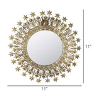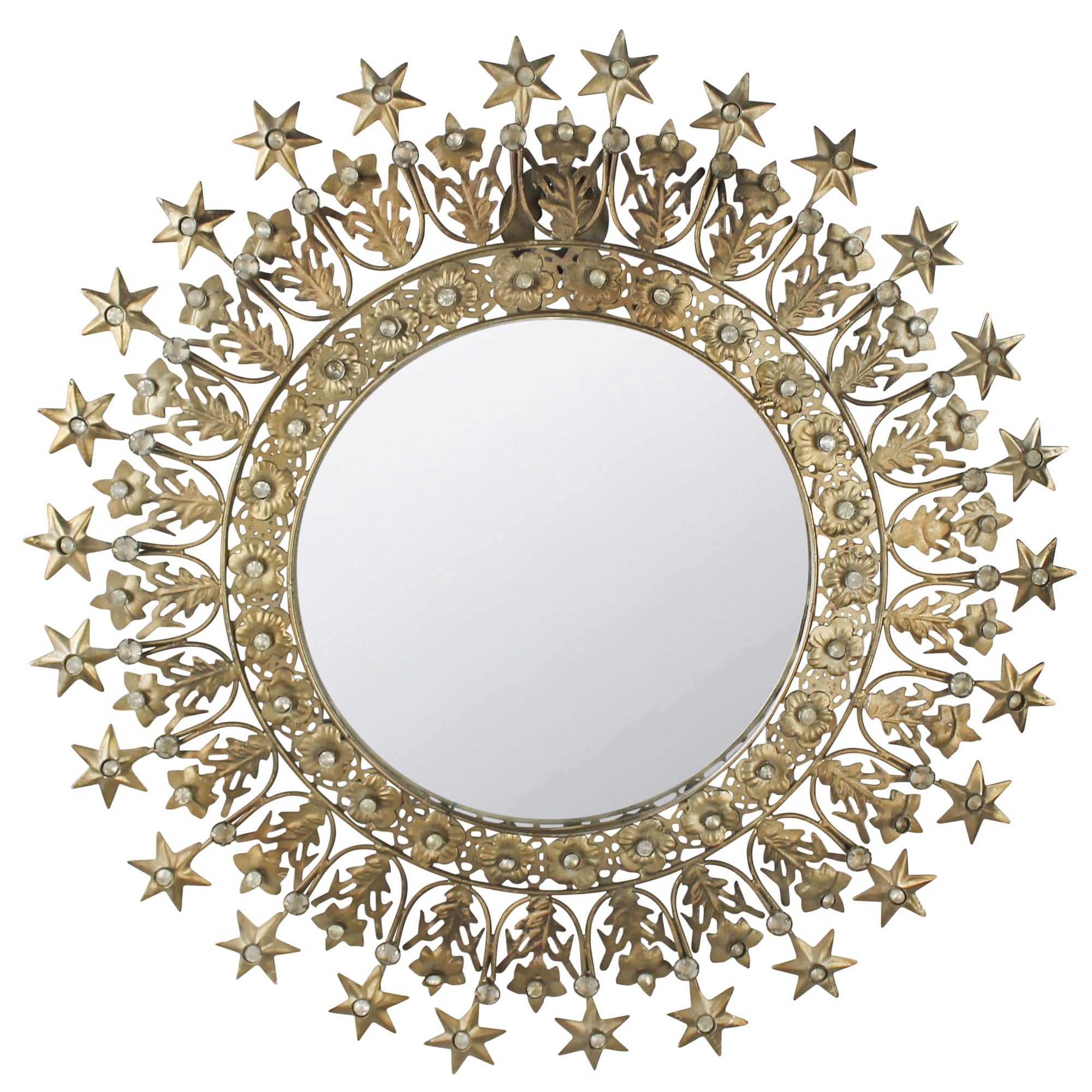 Crafted of hand forged metal with antiqued brass finishing this bejeweled mirror draws and reflects light. Surrounded by rings of stars it makes a celestial statement in the home.