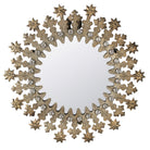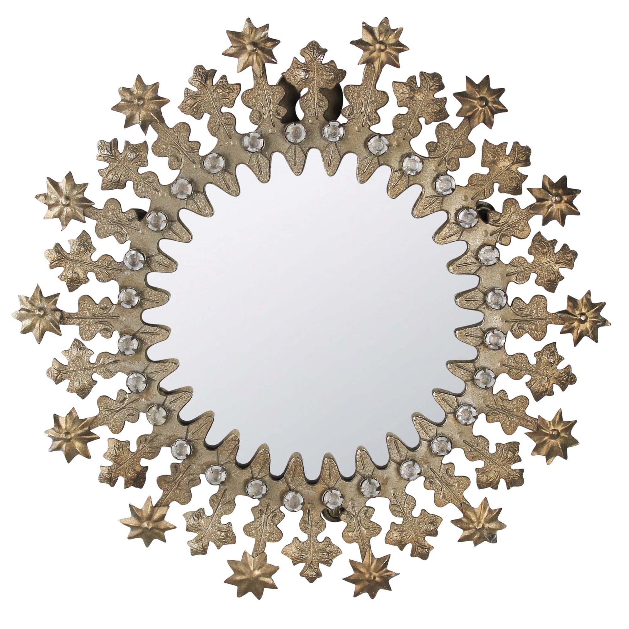 Crafted of hand forged metal with antiqued brass finishing this bejeweled mirror draws and reflects light. Surrounded by rings of stars it makes a celestial statement in the home.
