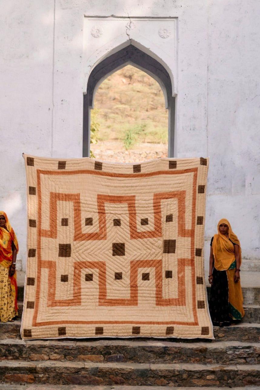 The design is hand-pressed onto each quilt using hand-carved wooden blocks dipped in dyes. The printed cotton shells are brought to the homes of quiltmakers, who stuff and stitch the quilts by hand, creating the final product.