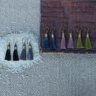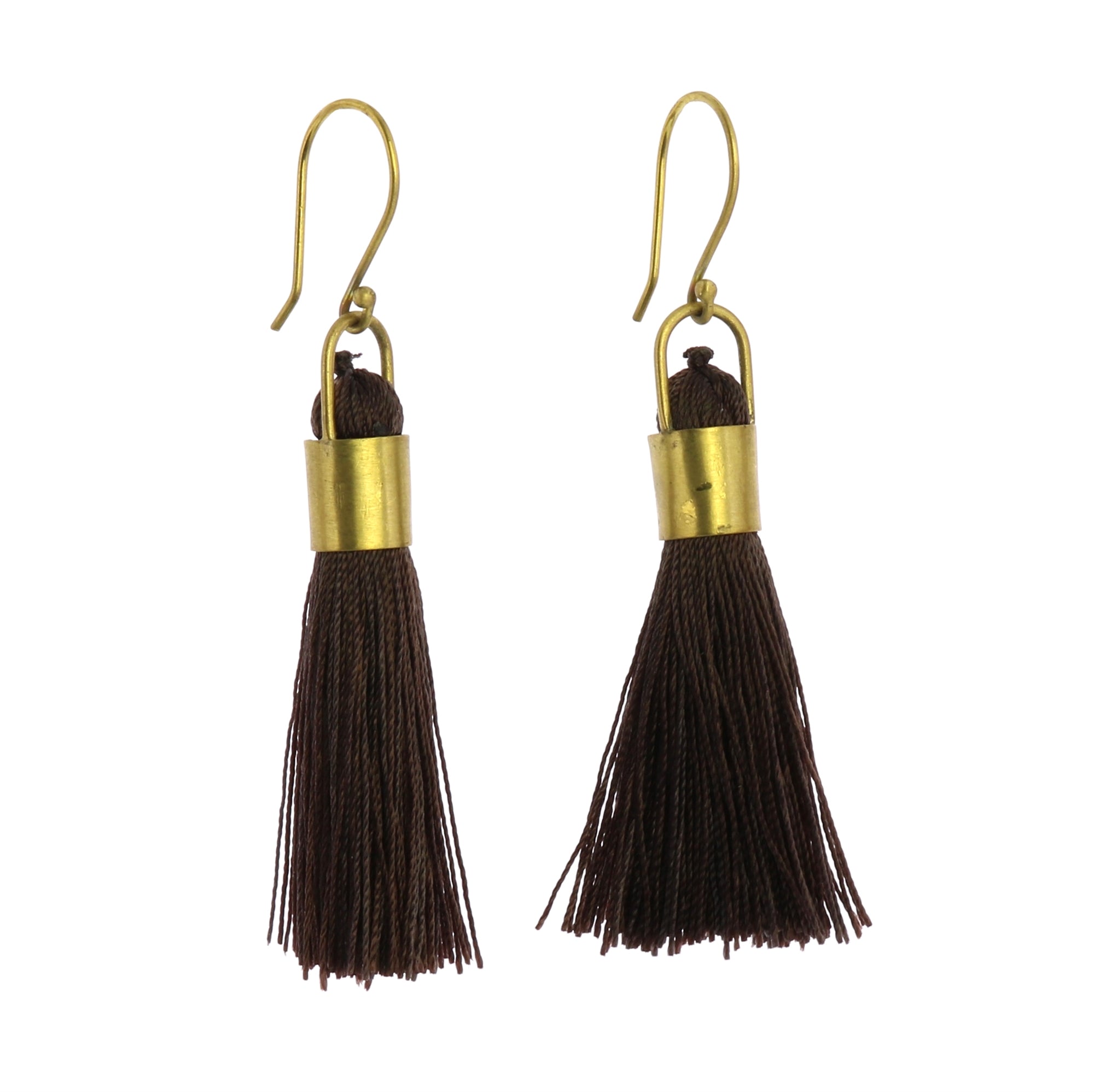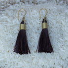 Soft and fluid synthetic silk tassels are bound with a brass cuff for a fashionable and fanciful earring.