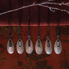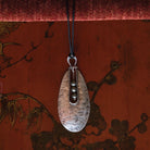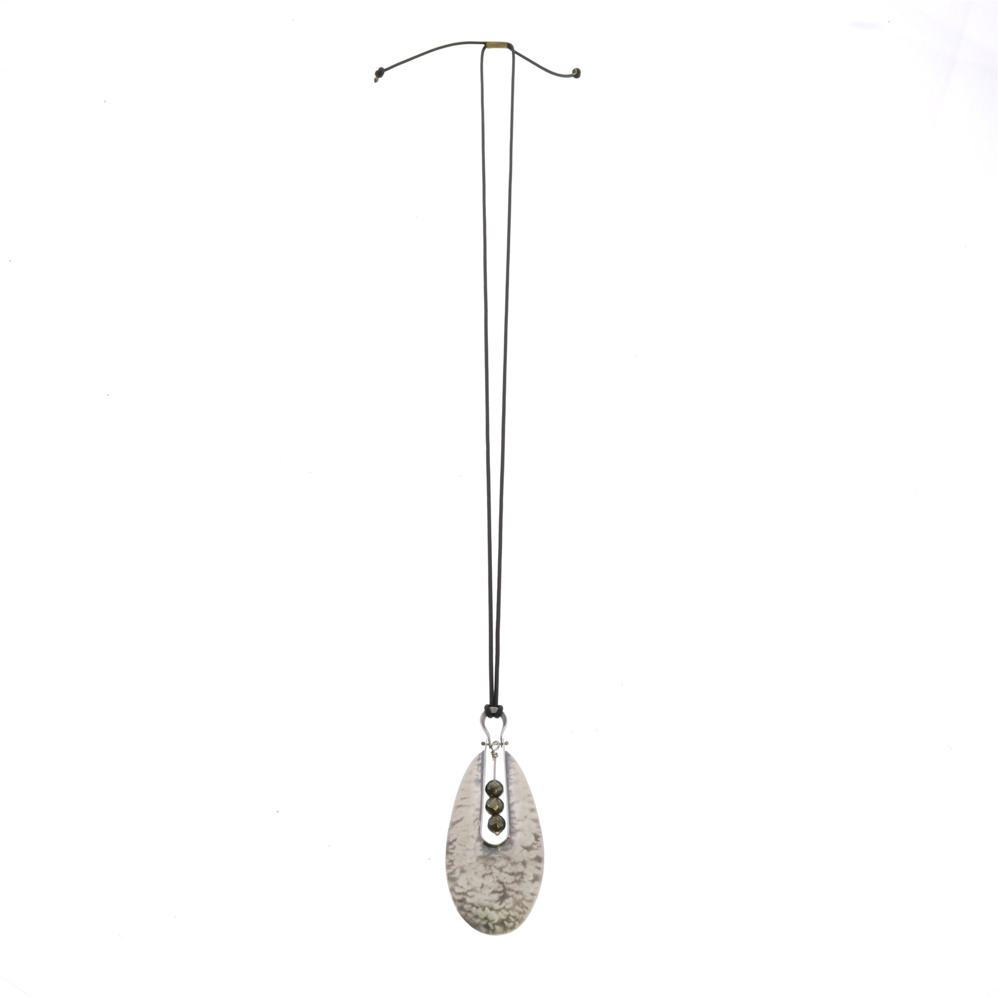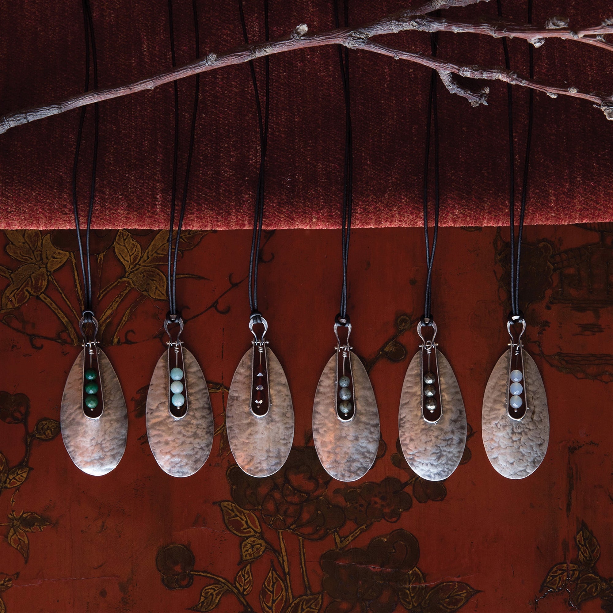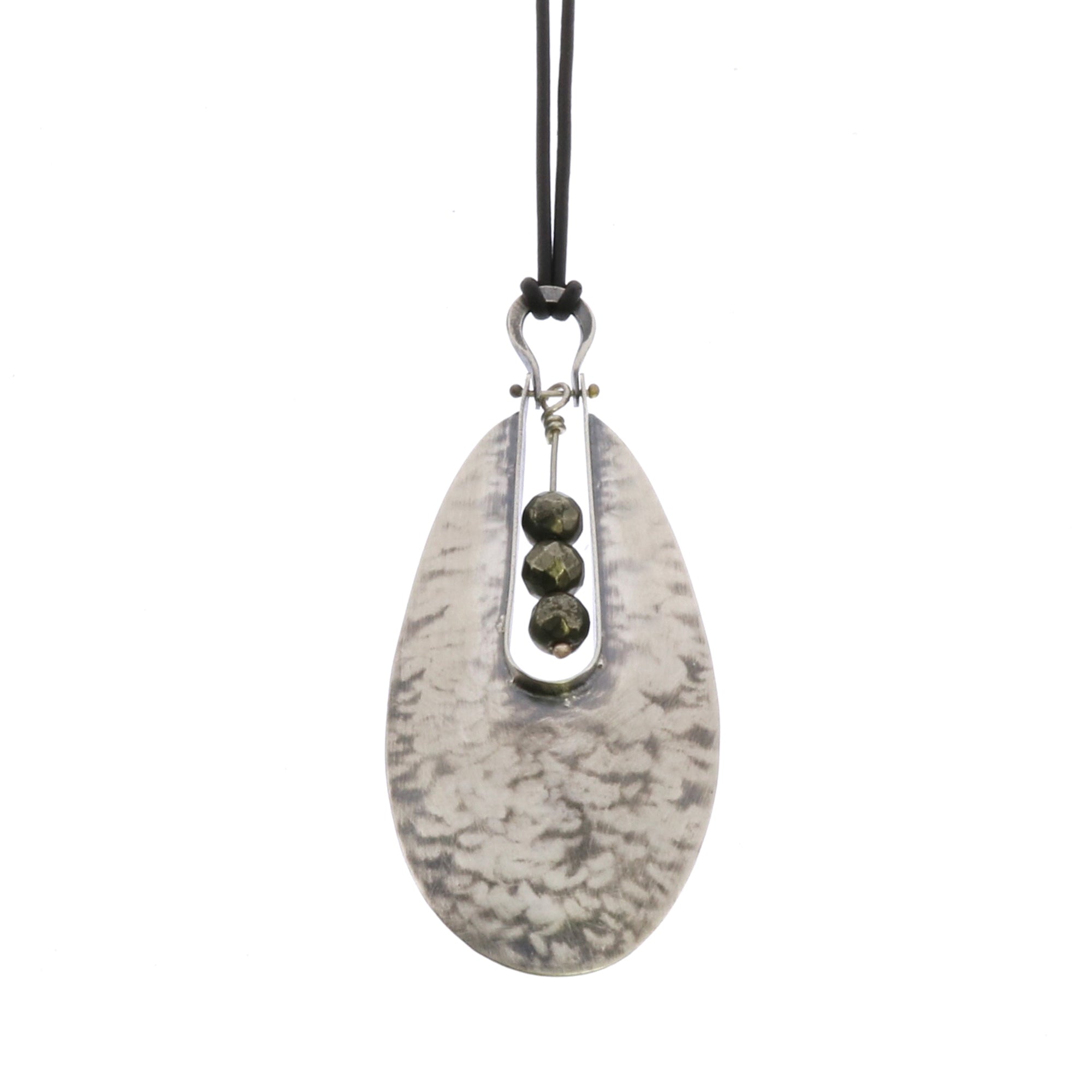 A slightly convex teardrop is hammered to add extra gleam to the silver form. A picture frame cutout frames a trio of glimmering gemstones. Silver-plated. Lasso tied with an adjustable soft leather cord. 1.5" pendant, 18" cord