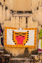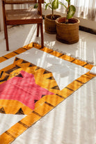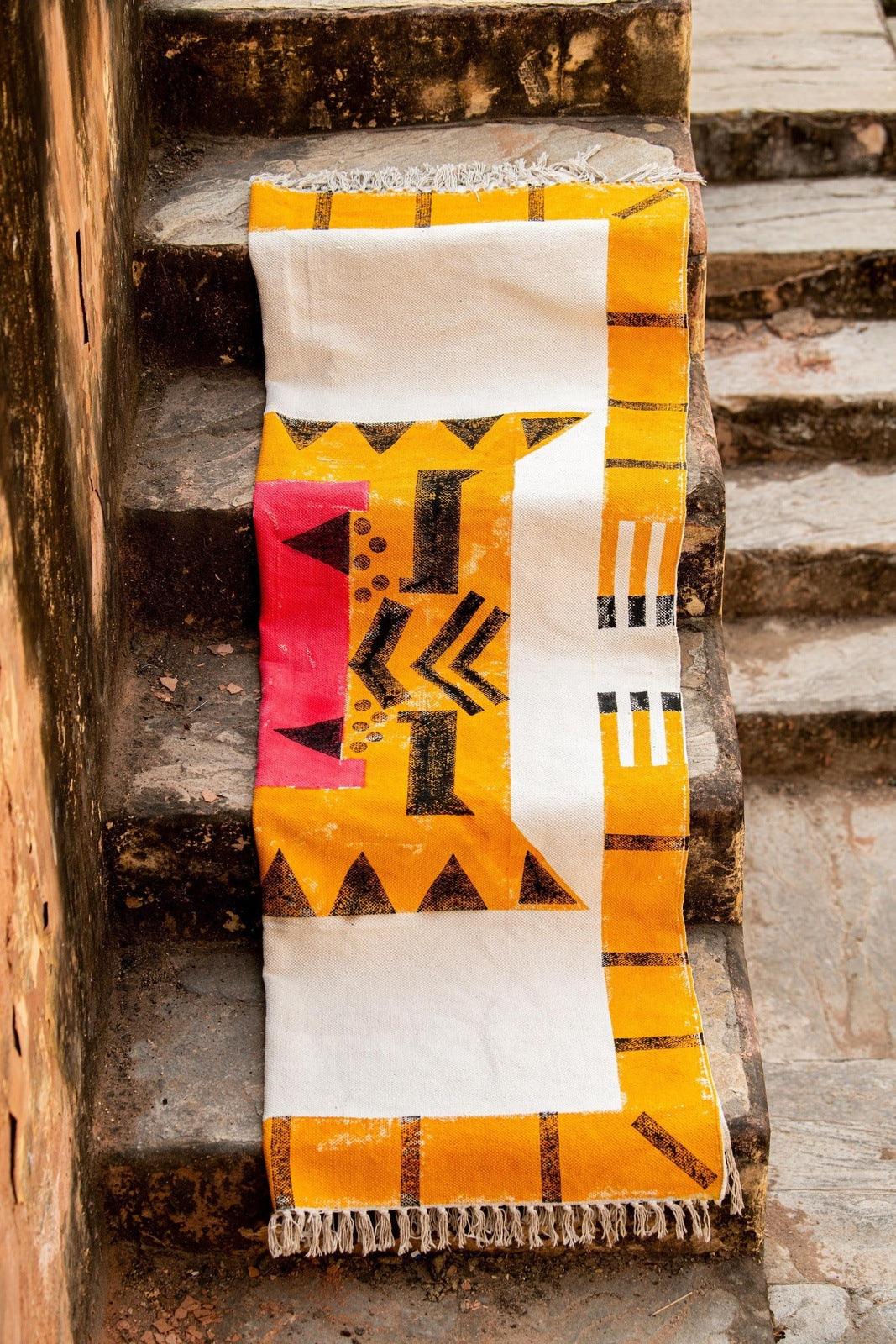 The design is hand-pressed onto each rug using hand-carved wooden blocks dipped in dyes. All rugs are made in small batches.