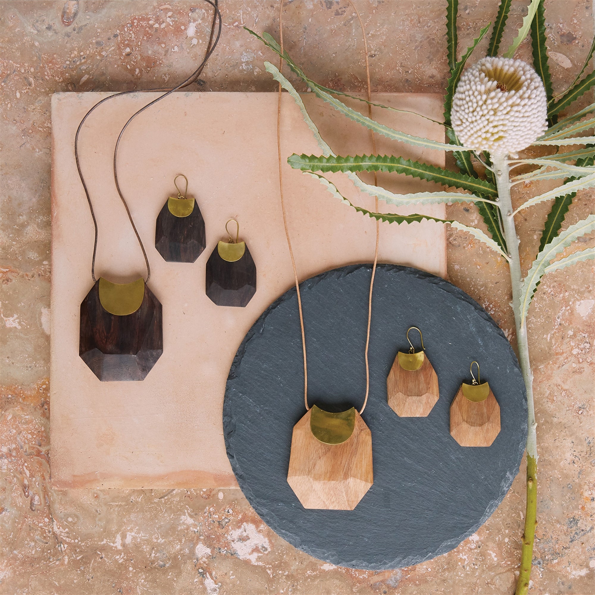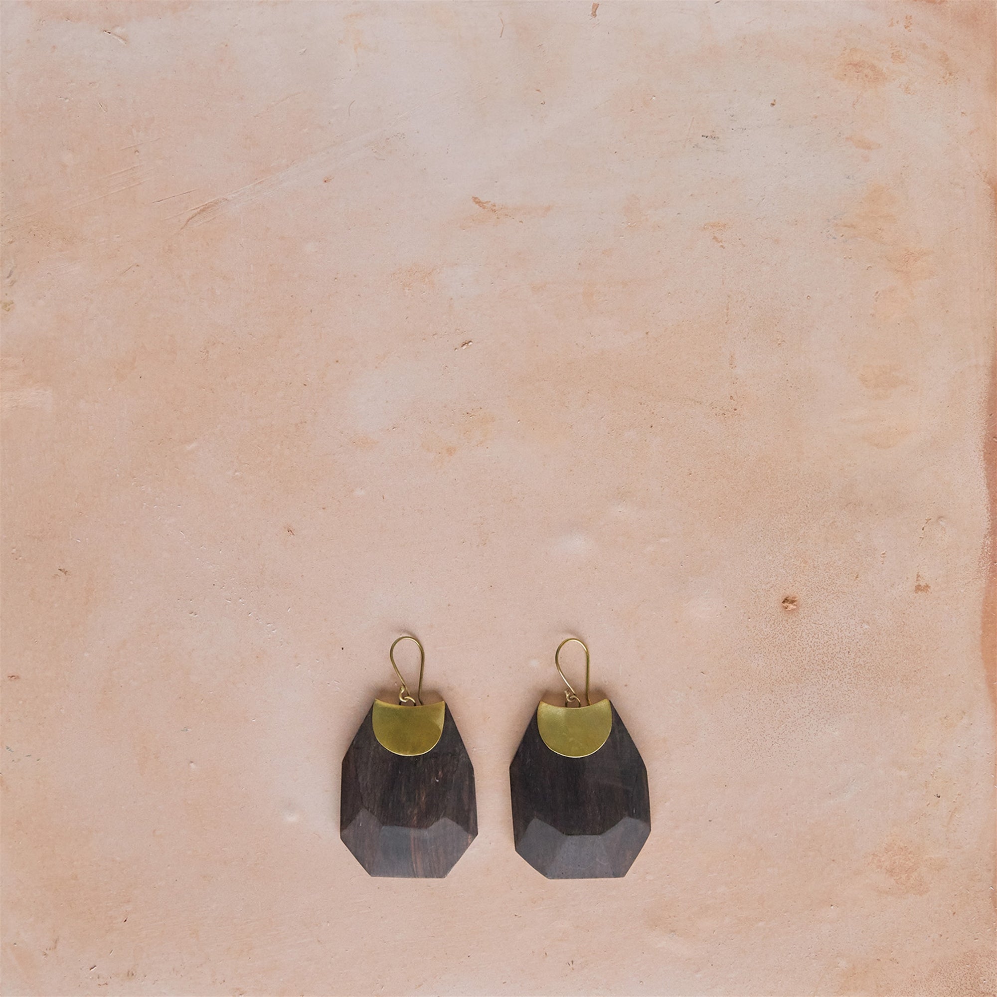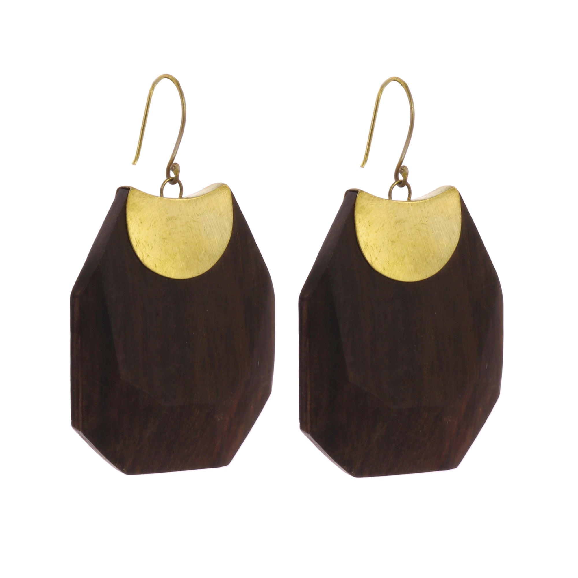 Topanga Earrings, Brass & Faceted Wood - Dark Wood