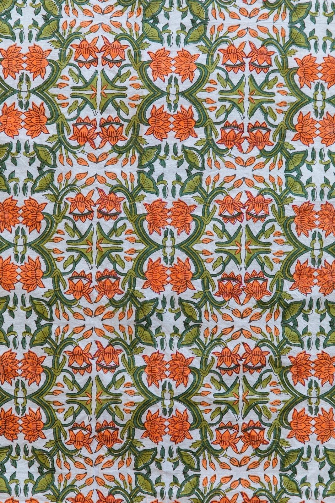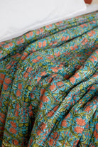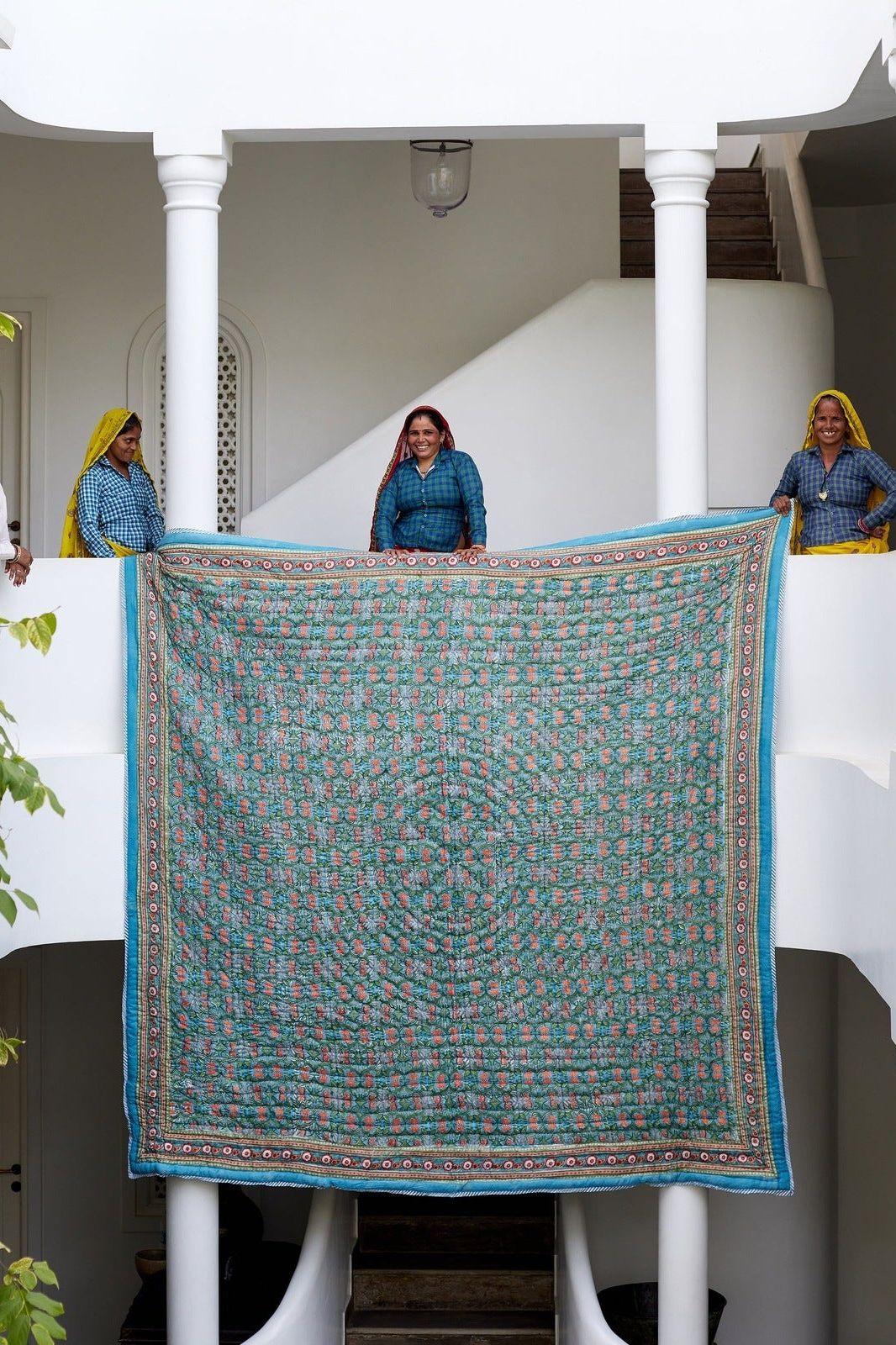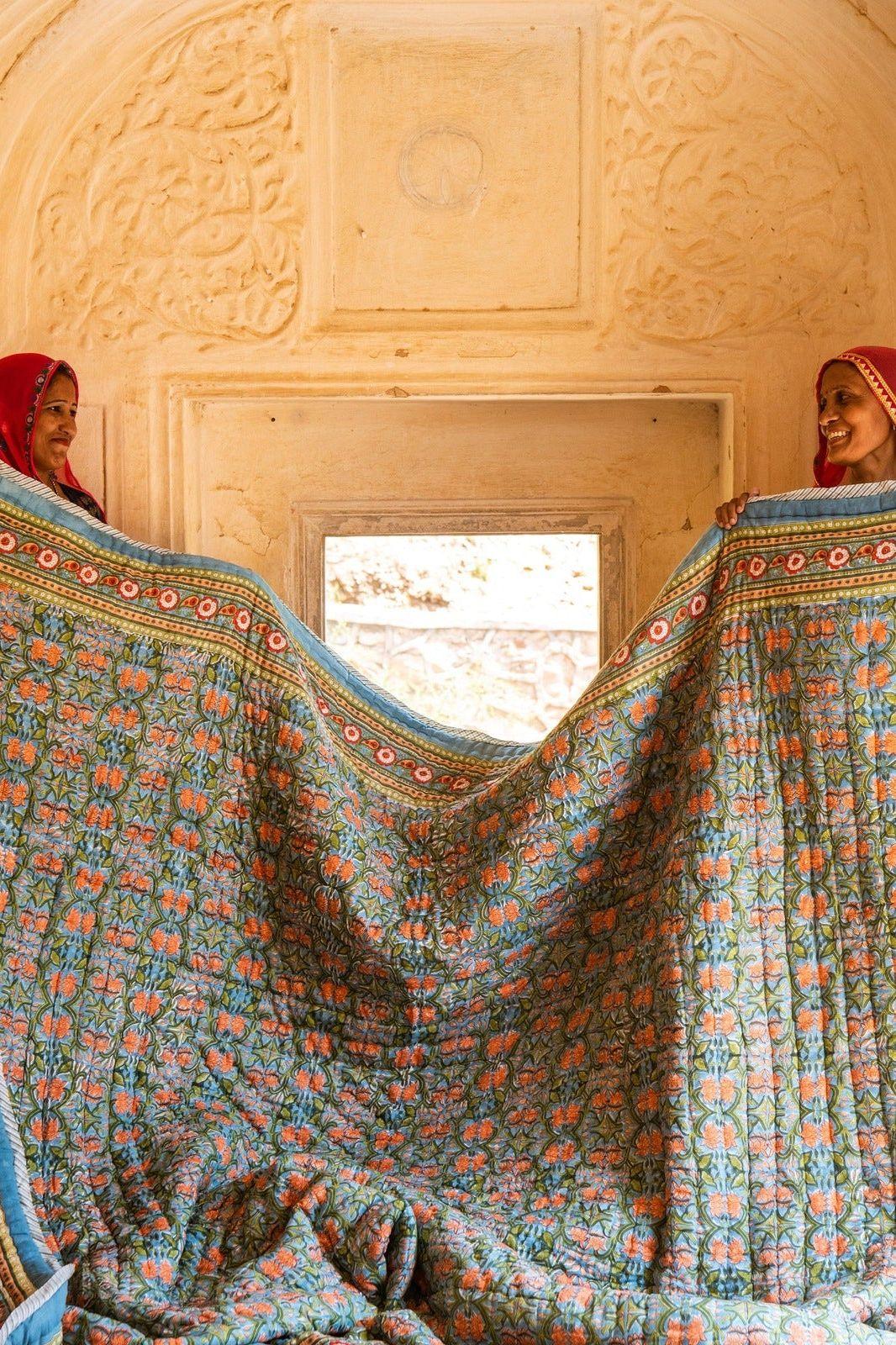 The design is hand-pressed onto each quilt using hand-carved wooden blocks dipped in dyes. The printed cotton shells are brought to the homes of quiltmakers, who stuff and stitch the quilts by hand, creating the final product.