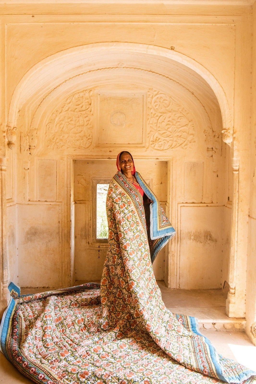 Each quilt is handmade, requiring attention from 4 different artisans, including wood carvers, block printers, quiltmakers, and dye specialists.