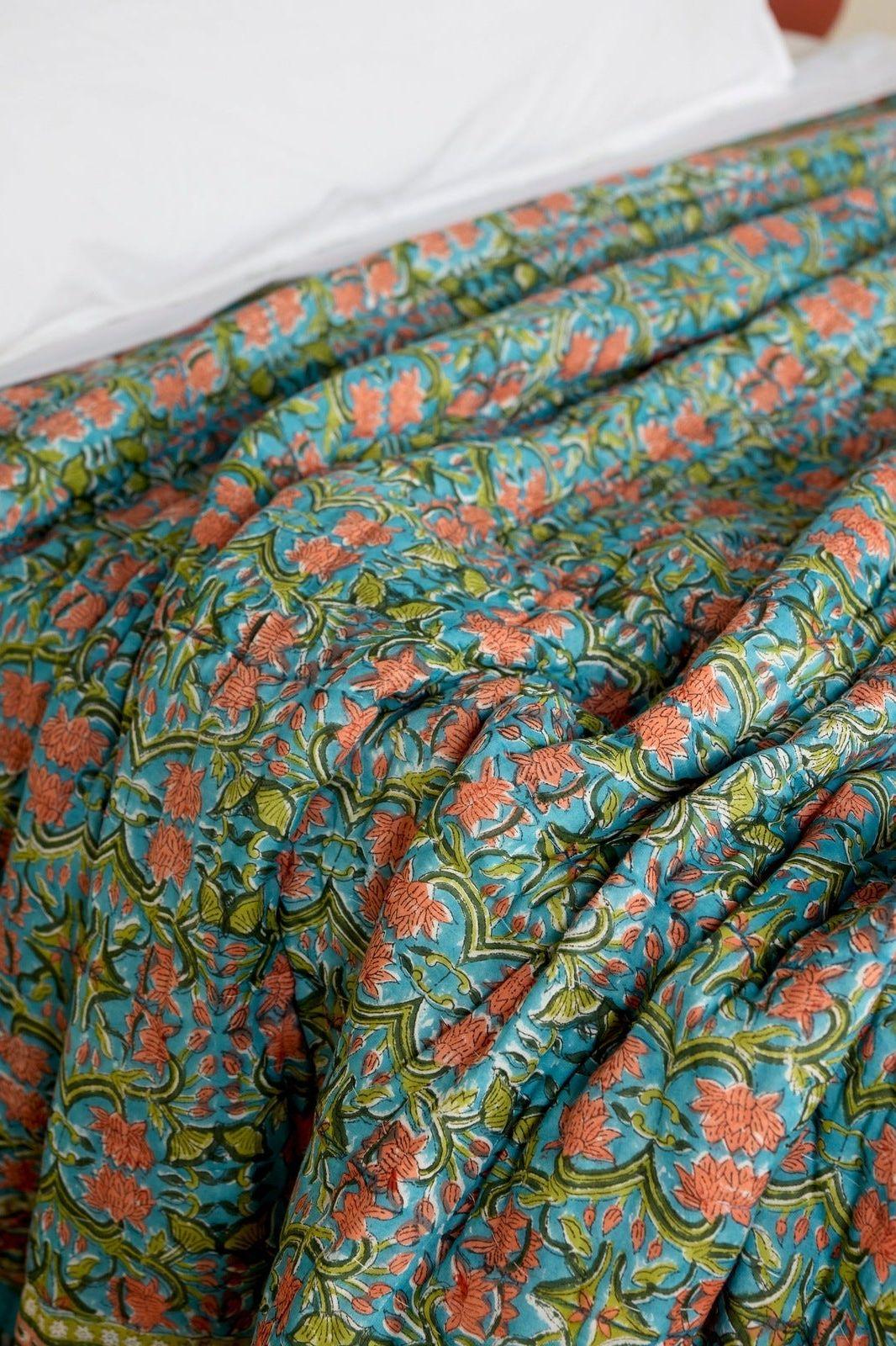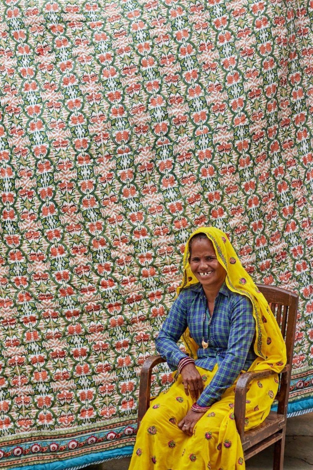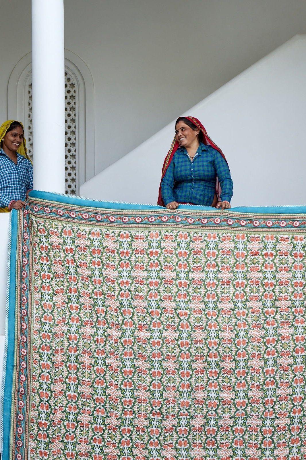 The design is hand-pressed onto each quilt using hand-carved wooden blocks dipped in dyes. The printed cotton shells are brought to the homes of quiltmakers, who stuff and stitch the quilts by hand, creating the final product.