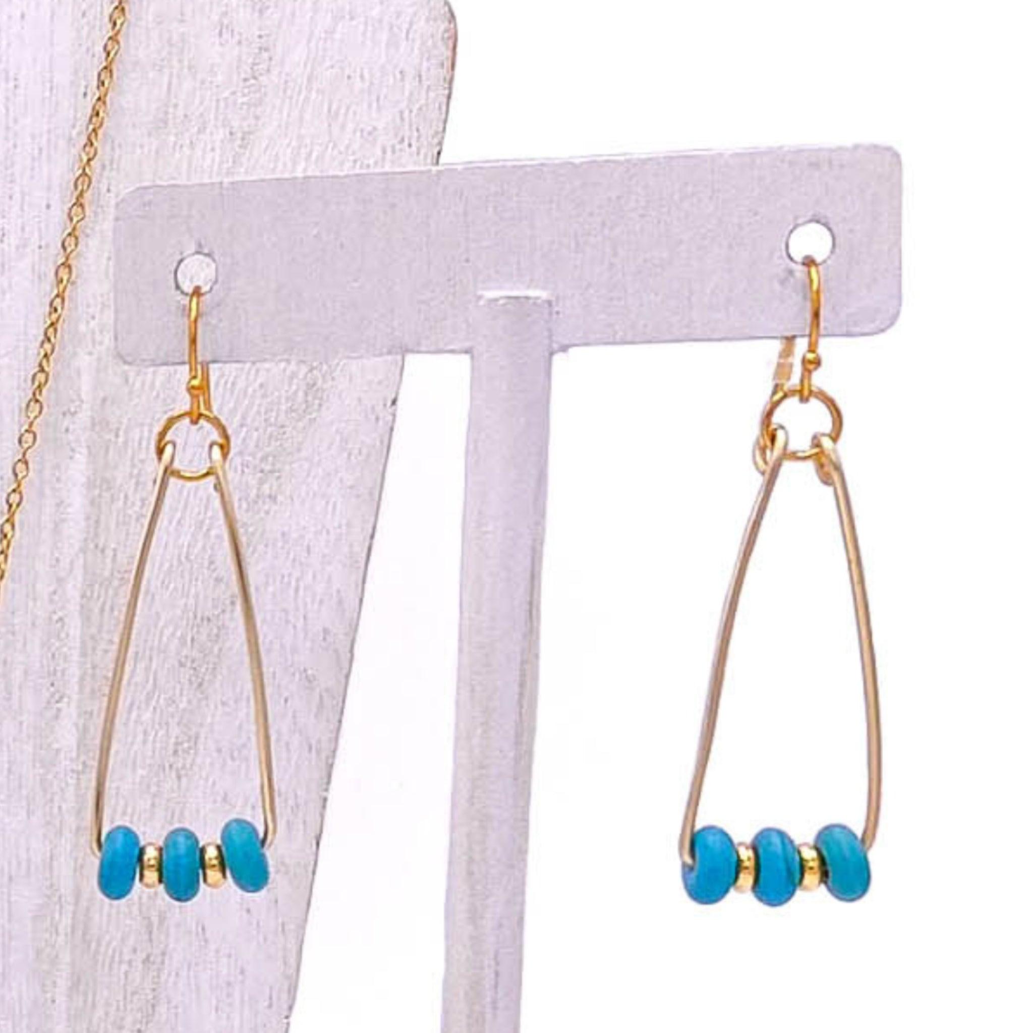 These Tranquility Earrings feature a beautiful triangle of gold plated wire holding 3 flat turquoise and gold plated spacers, secured with a fishhook. Wearing these earrings will bring an elegant simplicity to any ensemble.