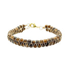 Rich chocolate brown mother of pearl beads with tan and grey are wired together in this flexible cuff bracelet with a lobster clasp and 1 1/2 inch extender. Fits 6 3/4 to 8 1/4 inch wrists.