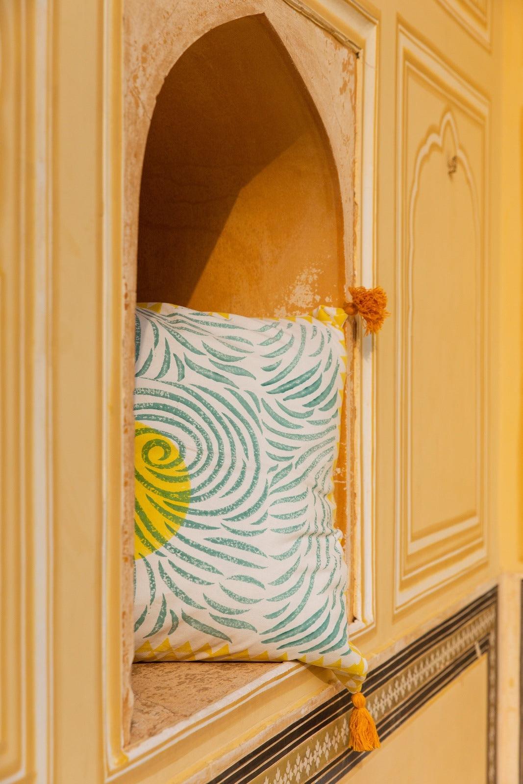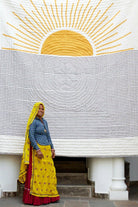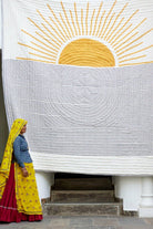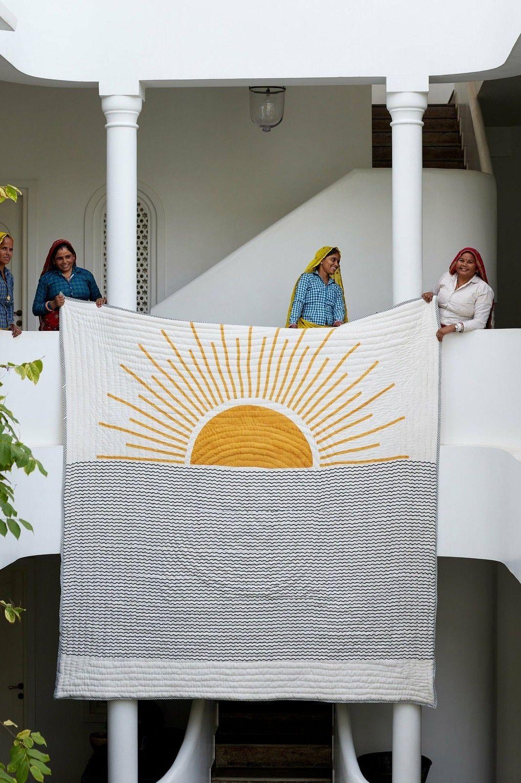 The design is hand-pressed onto each quilt using hand-carved wooden blocks dipped in dyes. The printed cotton shells are brought to the homes of quiltmakers, who stuff and stitch the quilts by hand, creating the final product.