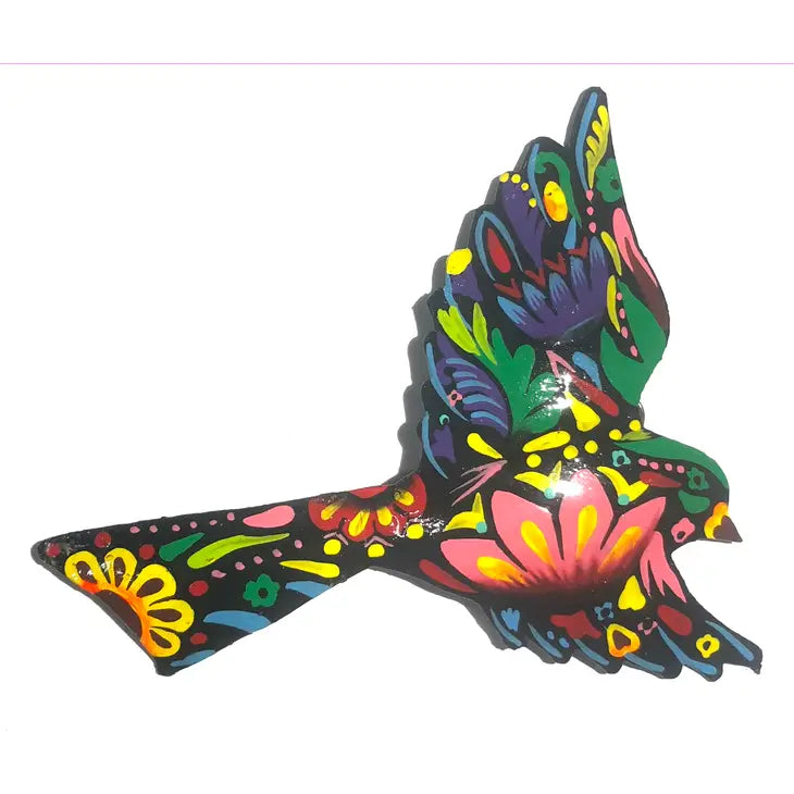 Vivid Flight is a painted metal wall art piece made for both indoor and outdoor decorative use. With bright contrasting colors and beautifully painted floral details, Vivid Flight will make a visual statement‚ in any home, patio, or garden area.