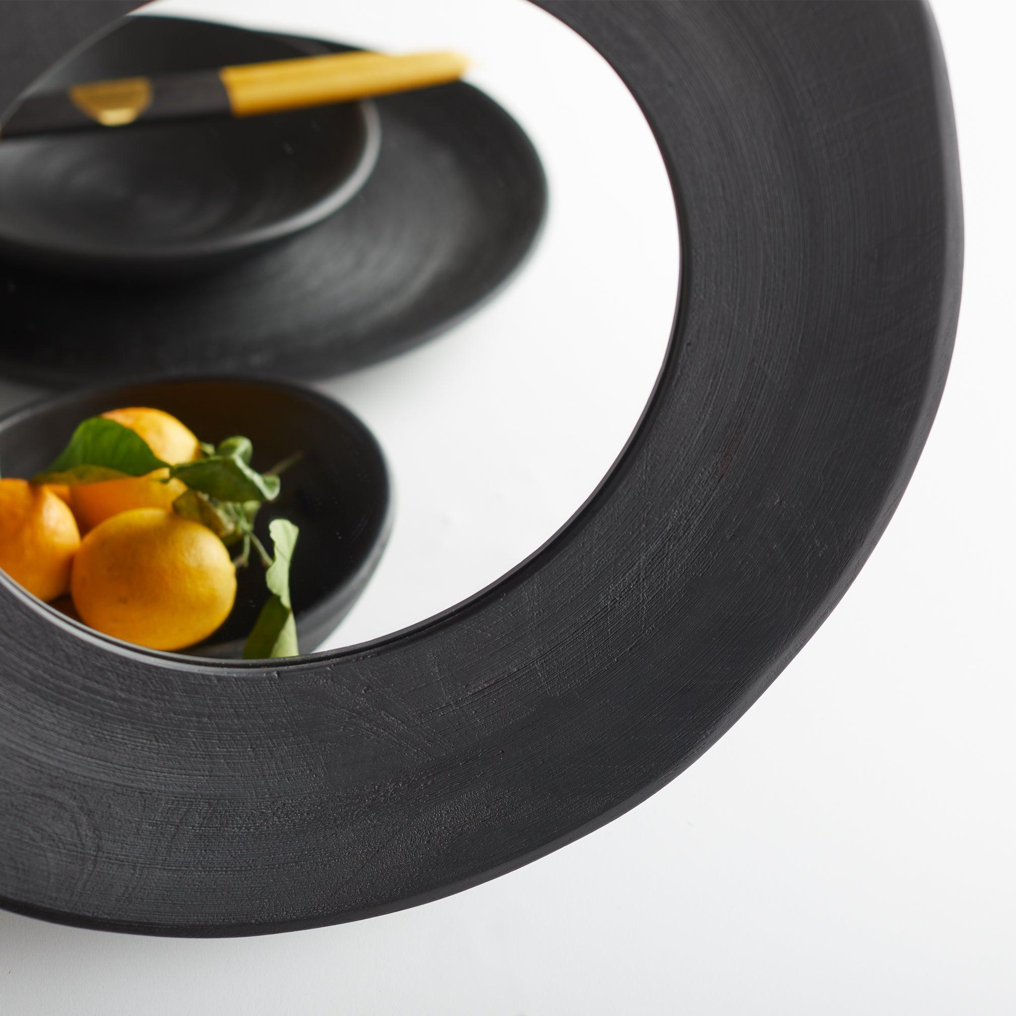 This rounded wall accent mirror features a broad border and D-ring hardware for hanging. These beautiful handmade items will vary from piece to piece due to their natural materials and individual craftsmanship.