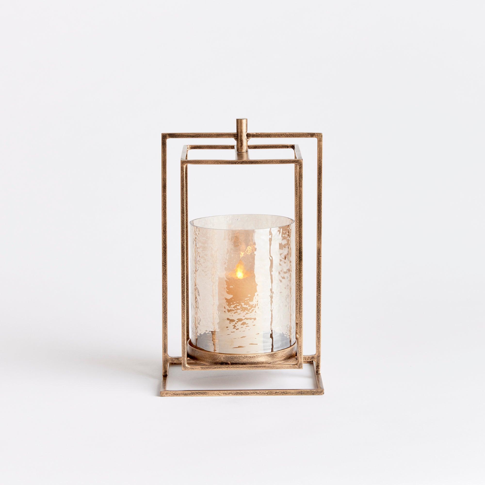 With a warm antique gold finish, elevated design and hammered lustre glass hurricanes, this candleholder is a work of art. Perfect for side table, entryway console or mantel.