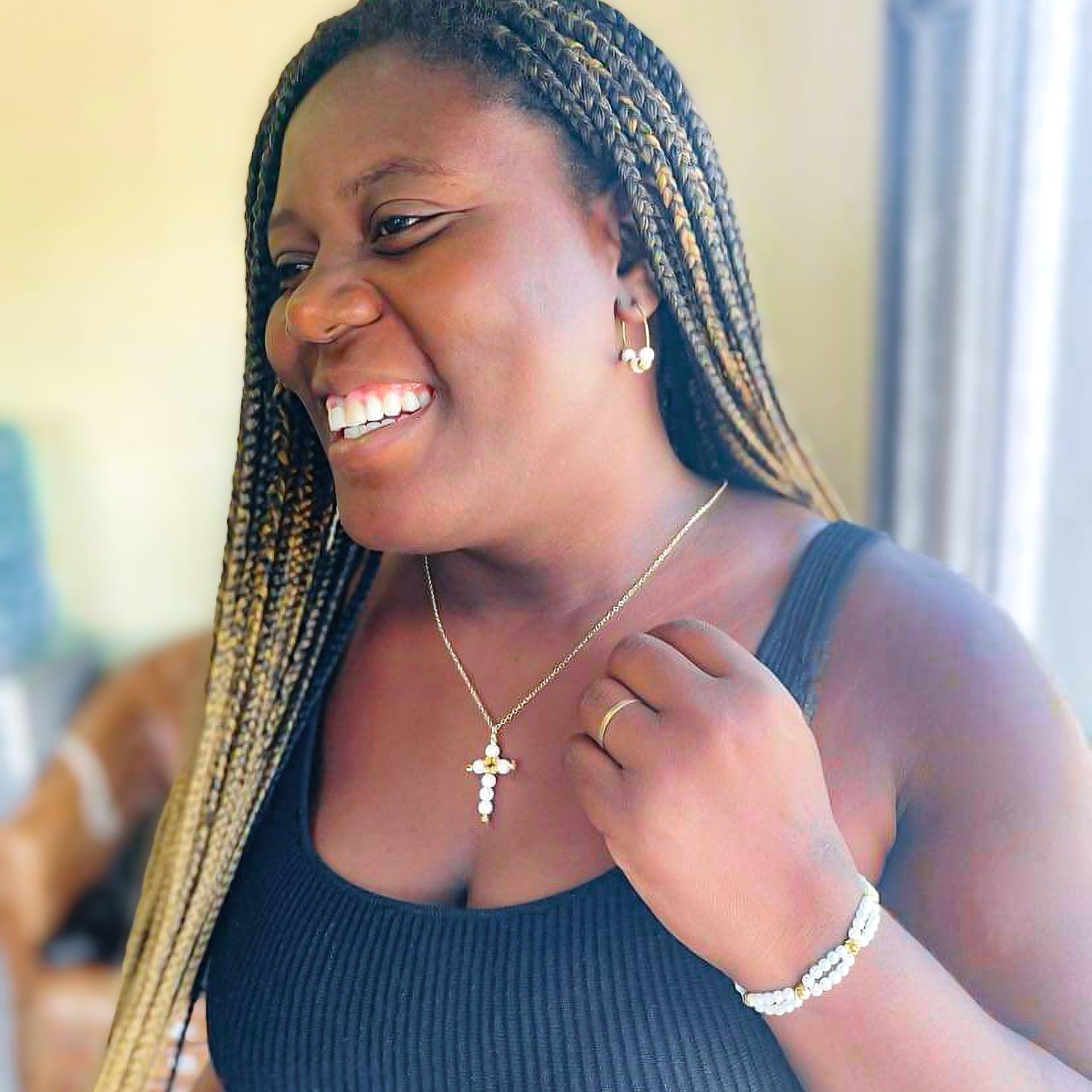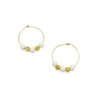 Opaque 7mm white jade beads and textured gold plated beads slide effortlessly on a 1 1/4 inch gold plated hoop.