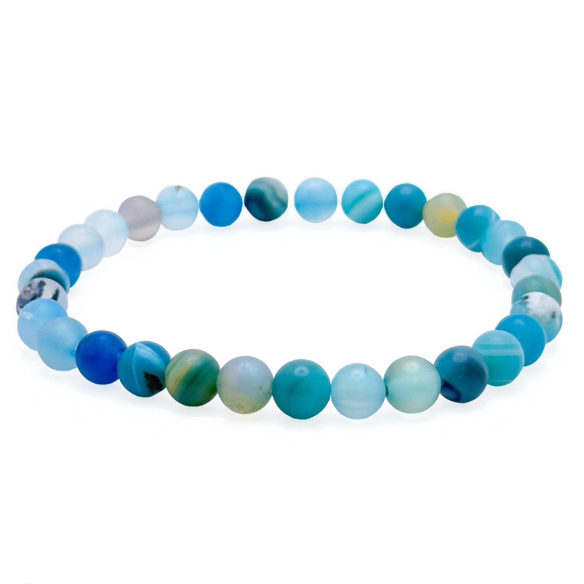 You loved these last fall in gold and fall colors, so we've created a new winter blue one! Turquoise, white and blue 6mm round agate beads in a simple 6 3/4 inch stretch bracelet form this winter must have.