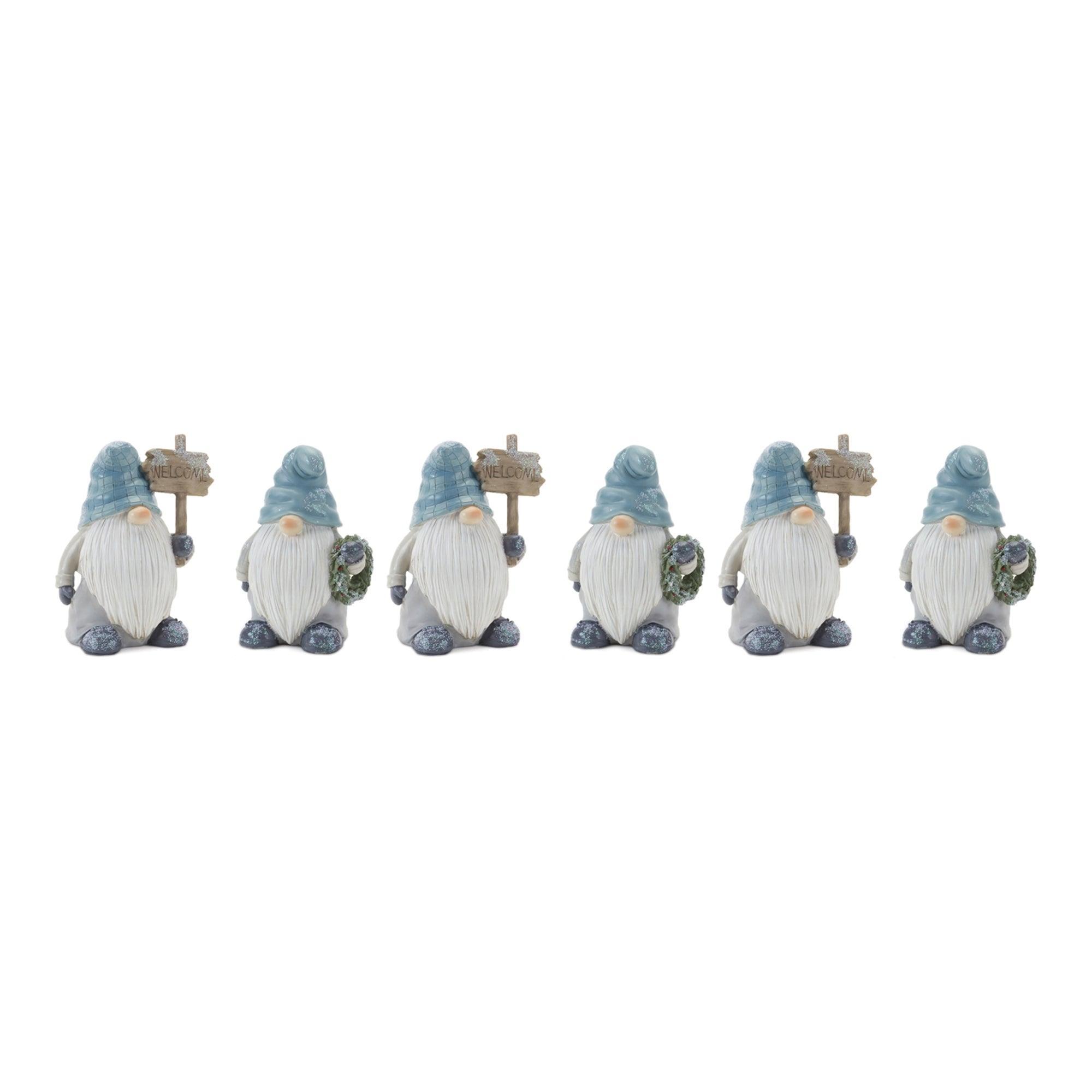 This holiday season, let this set of Winter Gnome Figurines bring a festive touch to your decor! With cool blue and grey tones, glitter frosted finish, and a fun "Welcome" sign accent, these charming figurines will sparkle in the decoration of any home. Crafted from durable polyresin composition, these festive little gnomes are sure to bring joy and cheer for years to come.