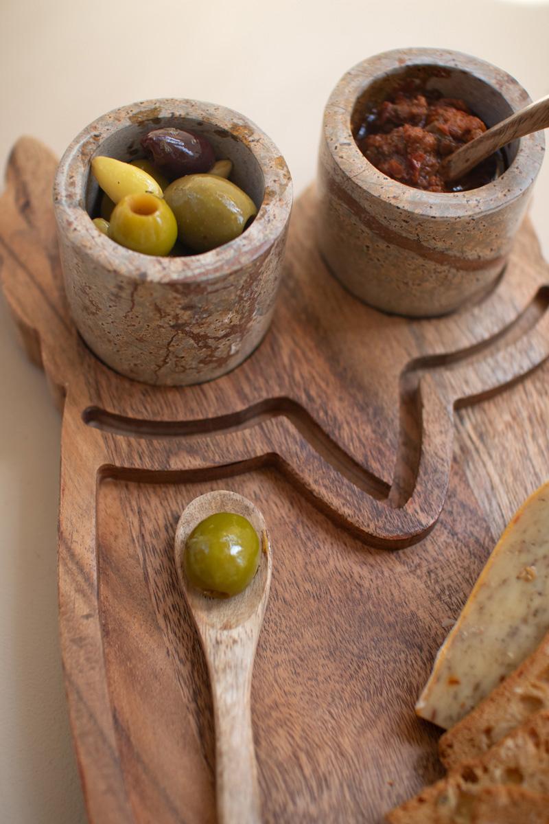 Wood Owl Serving Board With Marble Bowls