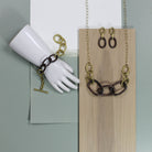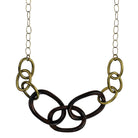 Walnut wood has been hand-carved to create unanimous links. Paired with brass links this collection is nothing less than exceptional. Necklace features adjustable chain. 8" of wood and brass links on 14" of chain
