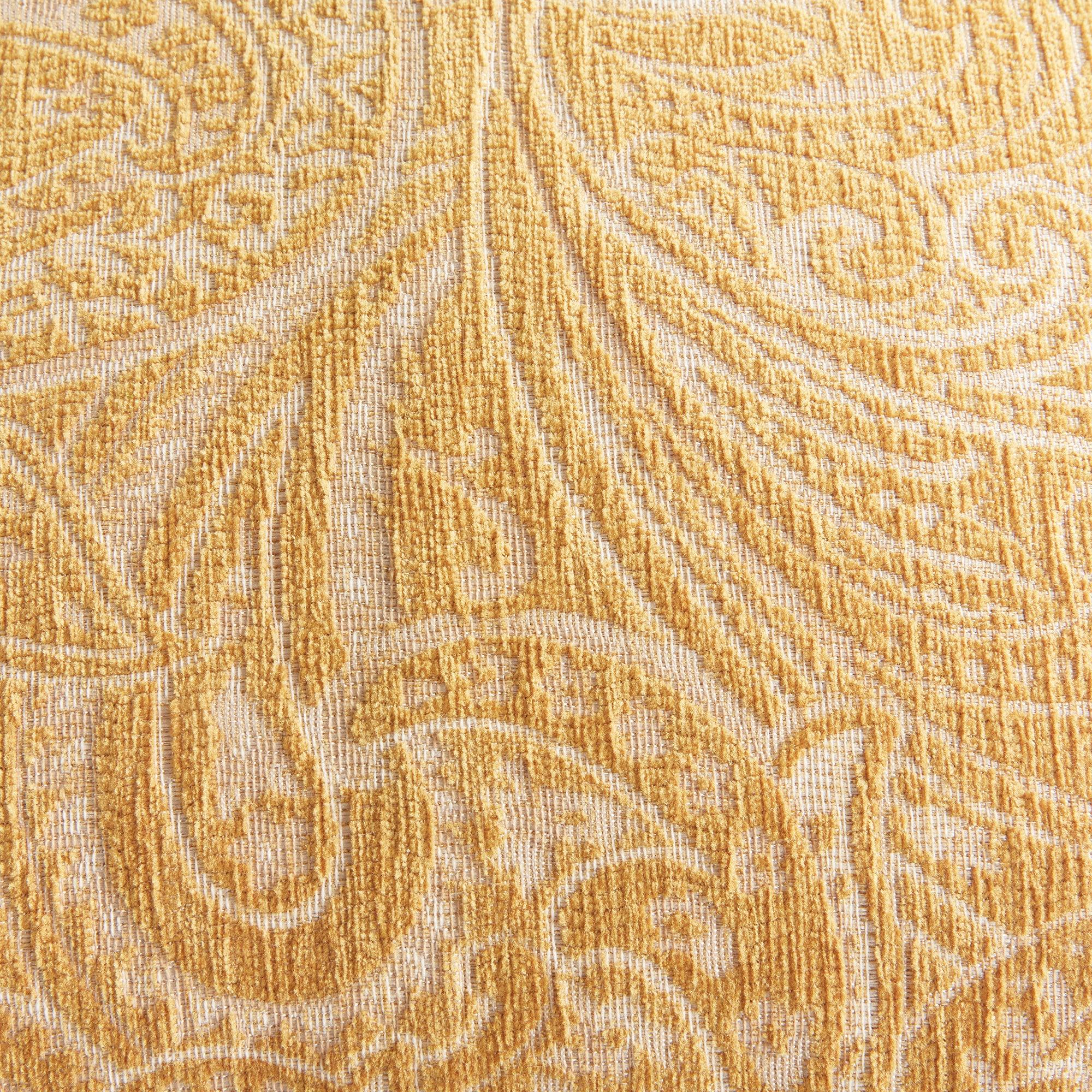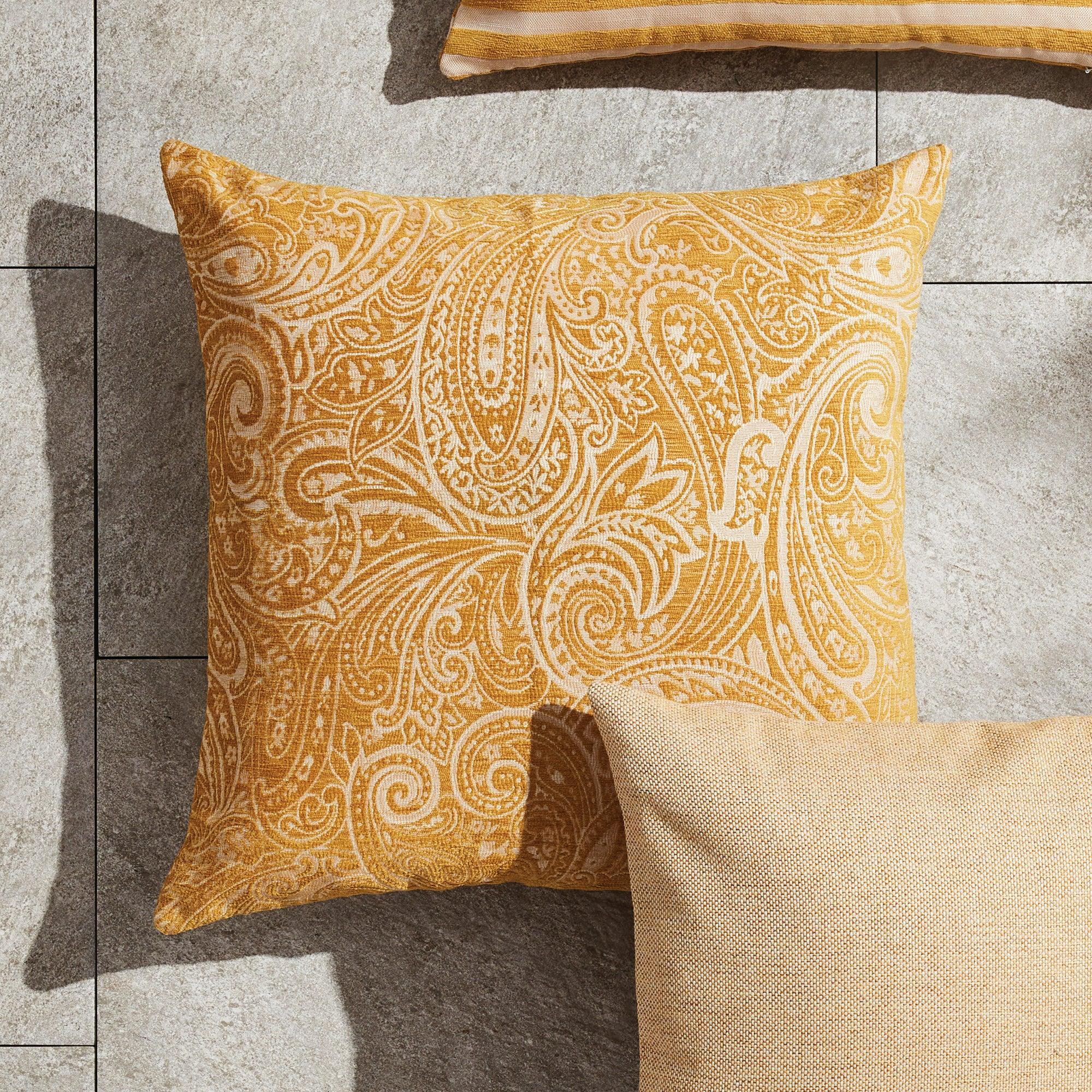 The indoor pillow that lives beautifully outdoors. Enjoy the upscale luxury and durability of Jacquard. With a rich ochre paisley pattern, it perks up any palette. This pillow is weather resistant and responsibly made. Filled with 100% recycled fibers.