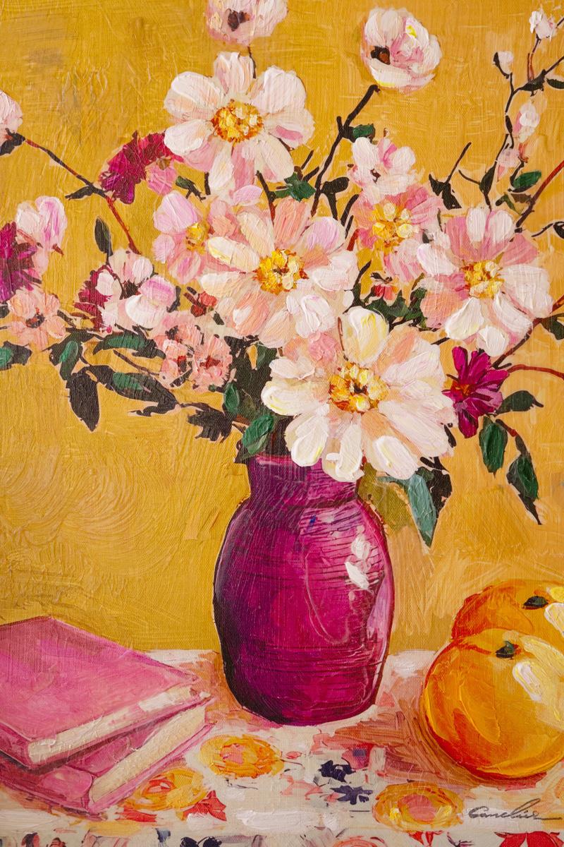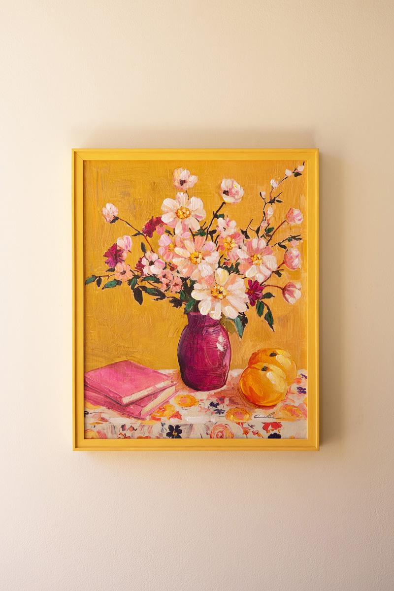 Brighten any room with this cheery yellow framed painting. It features a still life of a rosy vase and abundant pink blooms on top of a cheery tablecloth with books and fruit. This painting will liven any dark corner. Textured Paint. Hardware included.