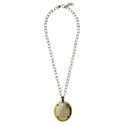 Zahara Pendant featuring a Mother of Pearl sunburst design, set in brass. The radiant, sunburst pattern adds a striking, luminous touch, creating a bold yet elegant statement piece for any jewelry collection. 2" pendant 18" adjustable chain