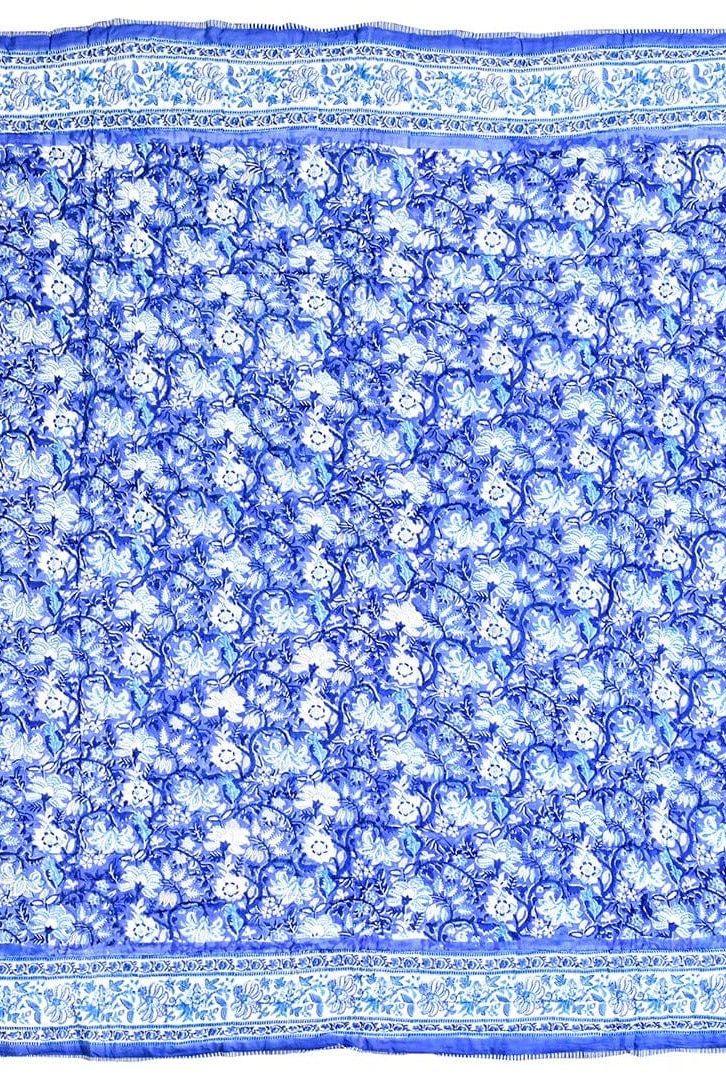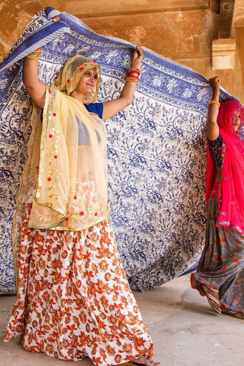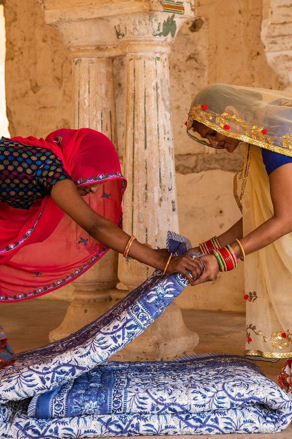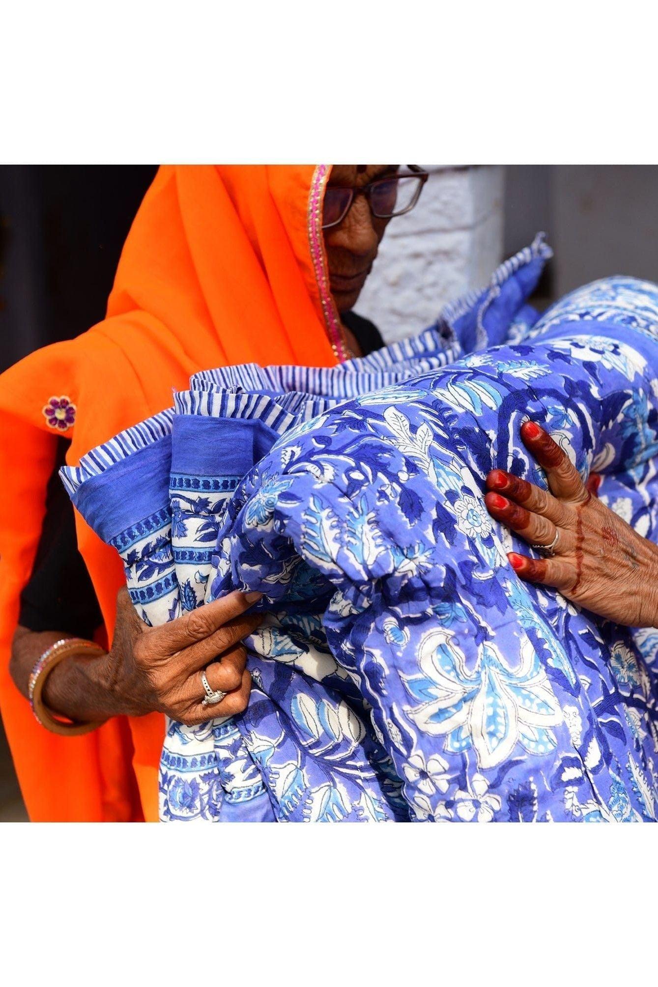 The design is hand-pressed onto each quilt using hand-carved wooden blocks dipped in dyes. The printed cotton shells are brought to the homes of quiltmakers, who stuff and stitch the quilts by hand, creating the final product.